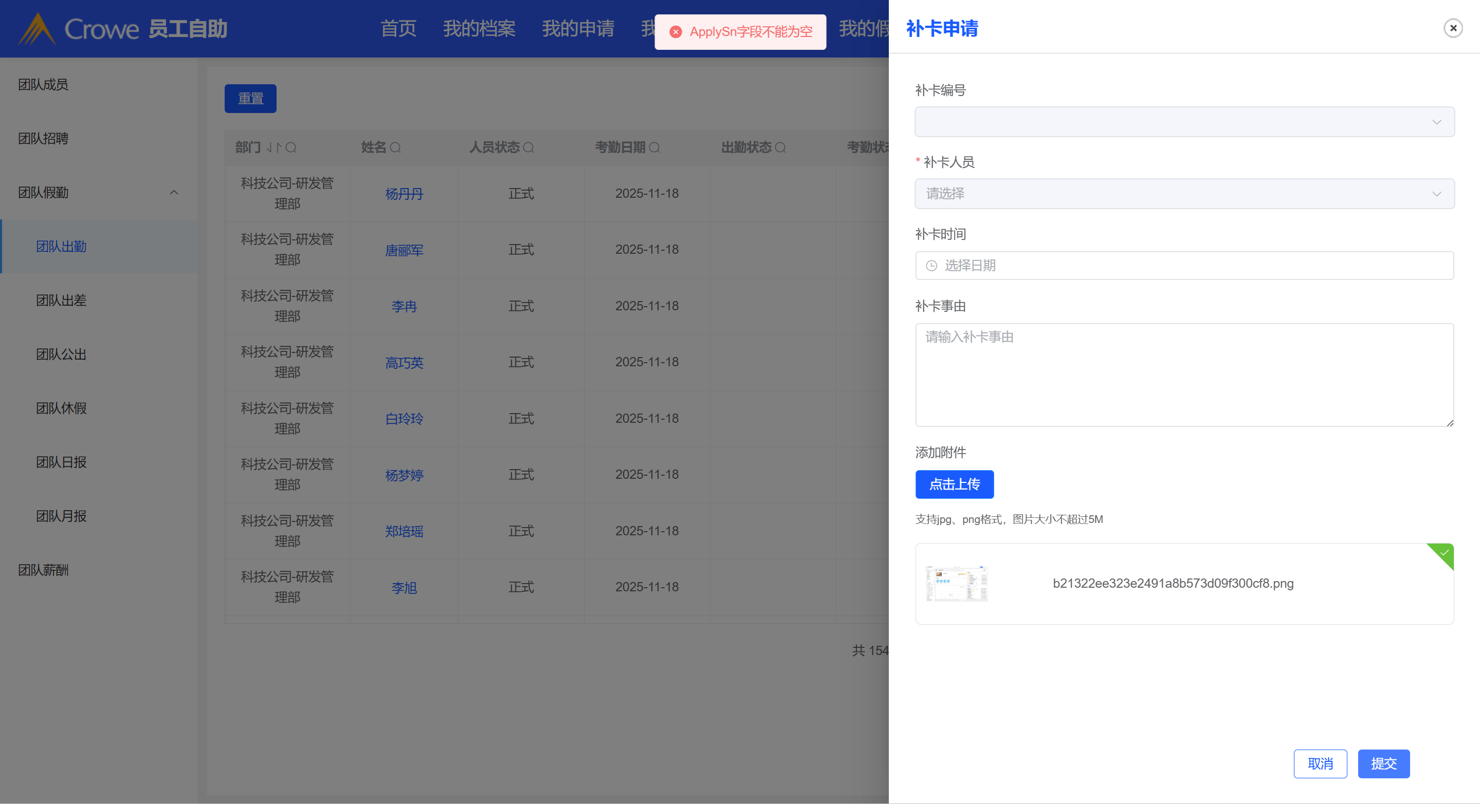 员工自助-团队出勤补卡提交完成后,表单未初始化