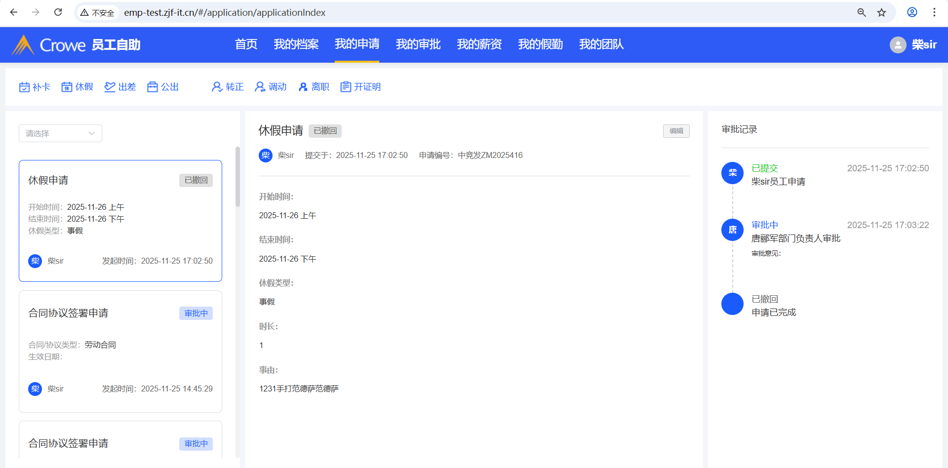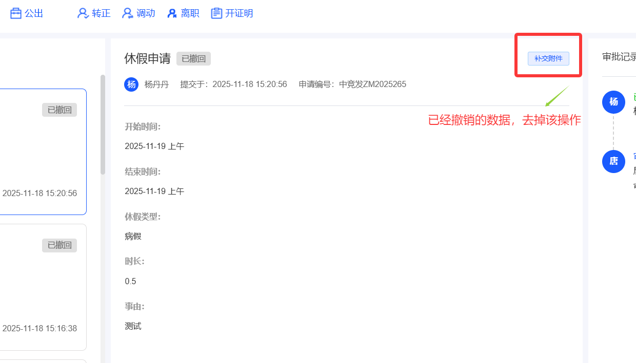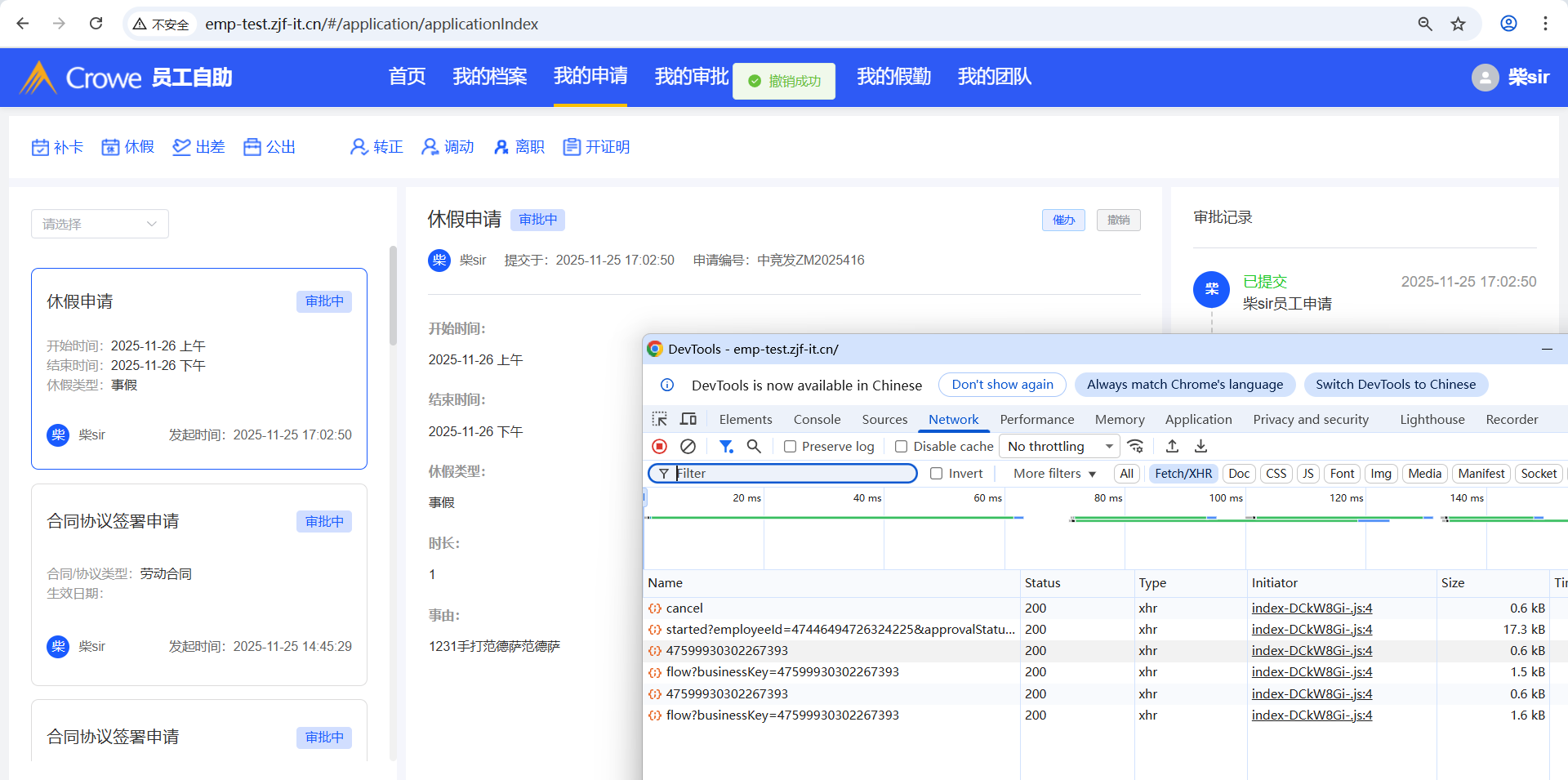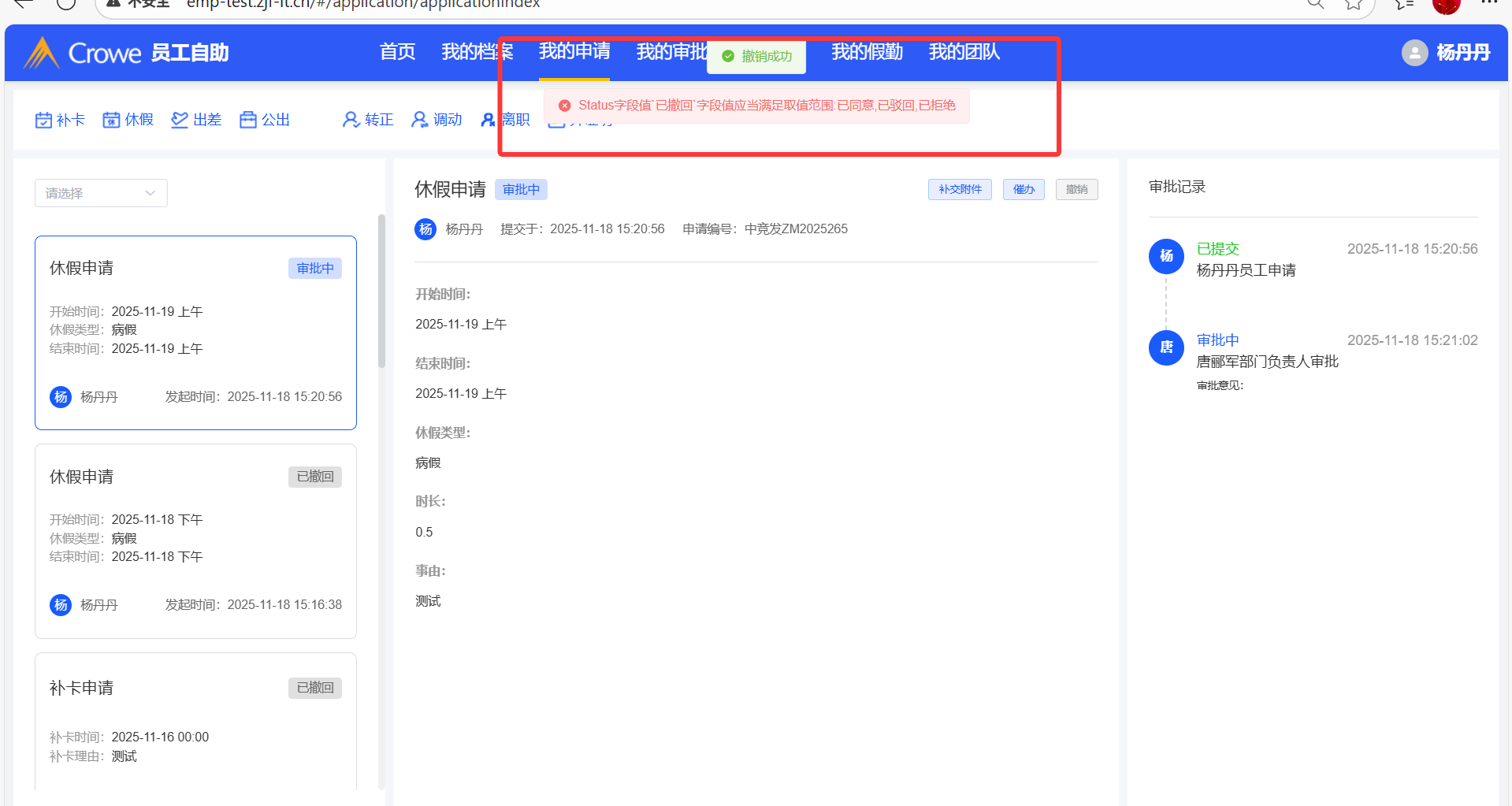 已关闭我的申请,撤销请假申请后报错,刷新页面显示撤销状态