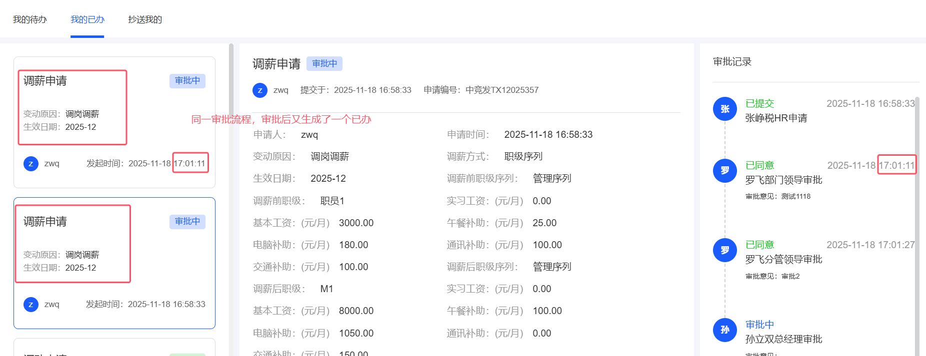 我的审批-同一审批流程,审批后已办中又生成了一个相同的