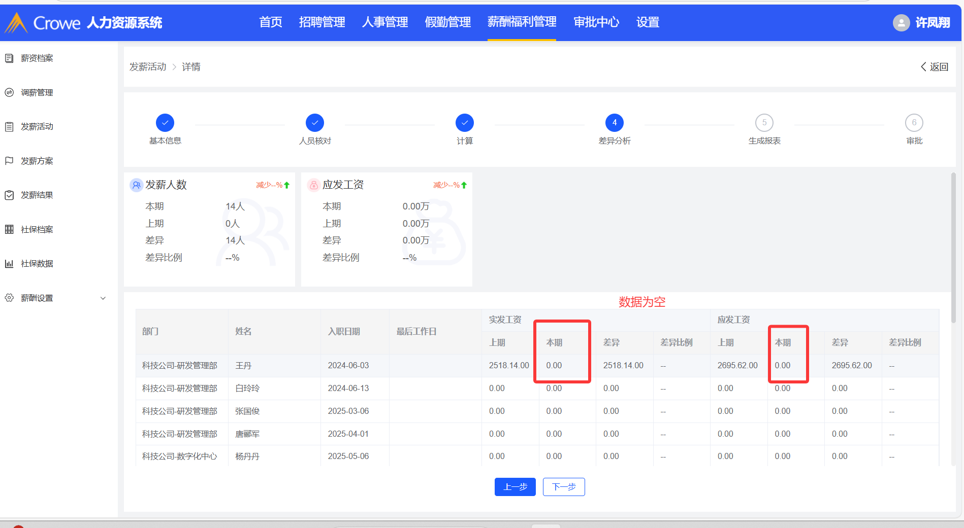 发薪活动--差异分析,本期实发工资和应发工资数据为空
