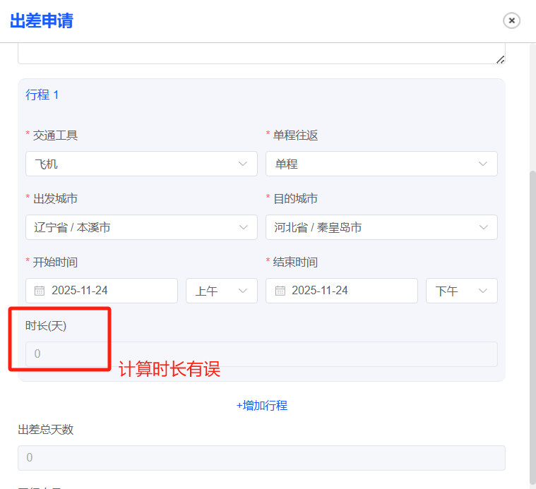 出差/休假/公出申请-时间计算错误