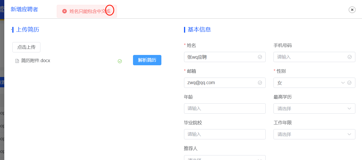 招聘管理-新建应聘者姓名含有英文点击保存时提示语修改