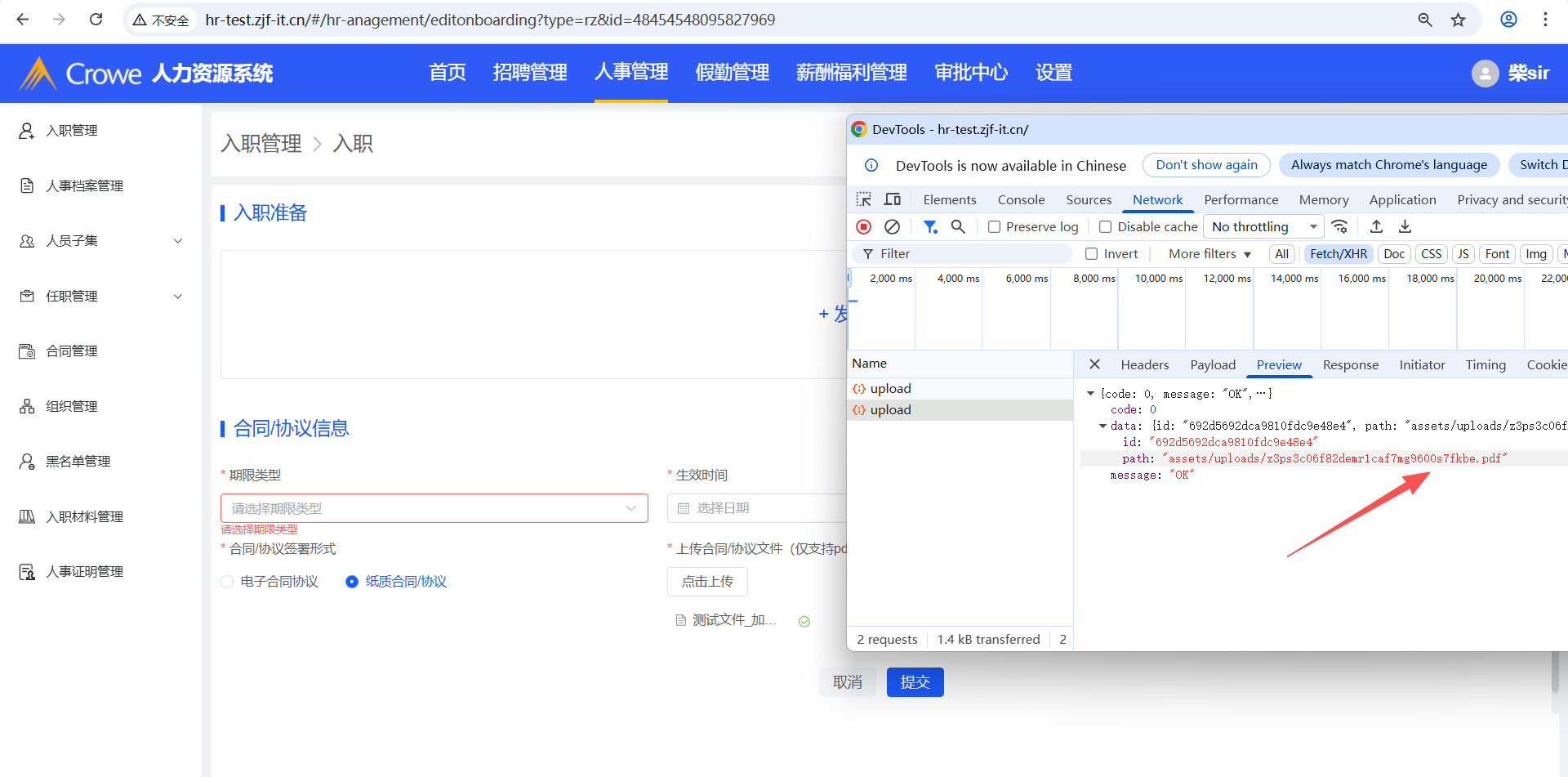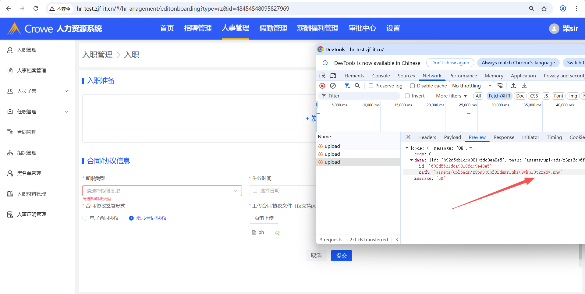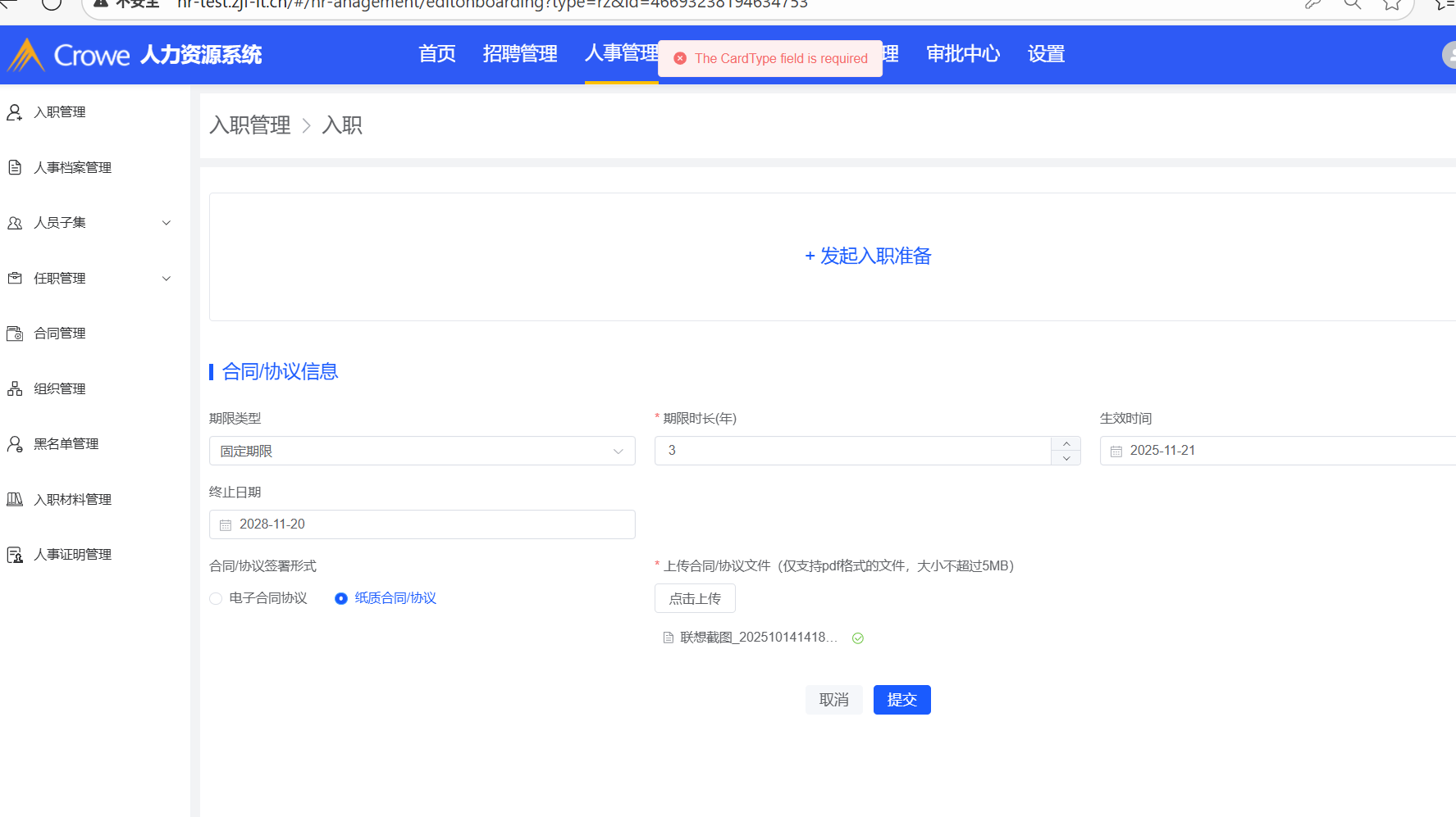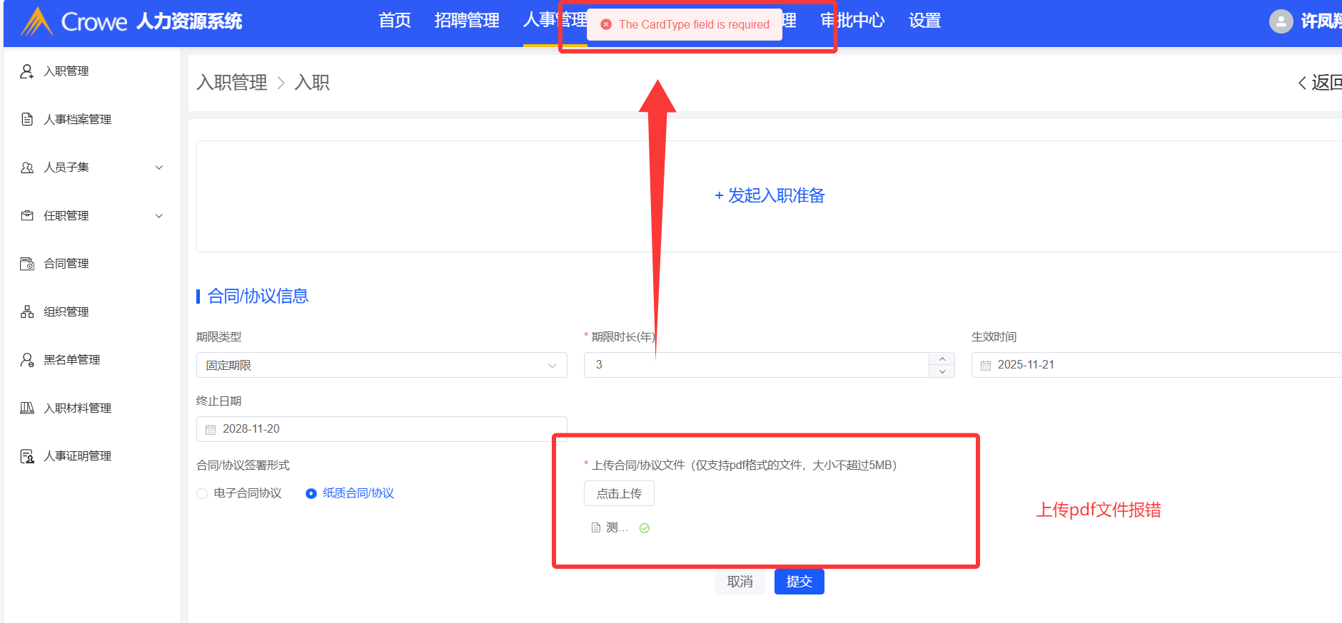 入职管理--待入职,点击入职管理列表中的“入职”,根据提示上传合同附件pdf格式 报错