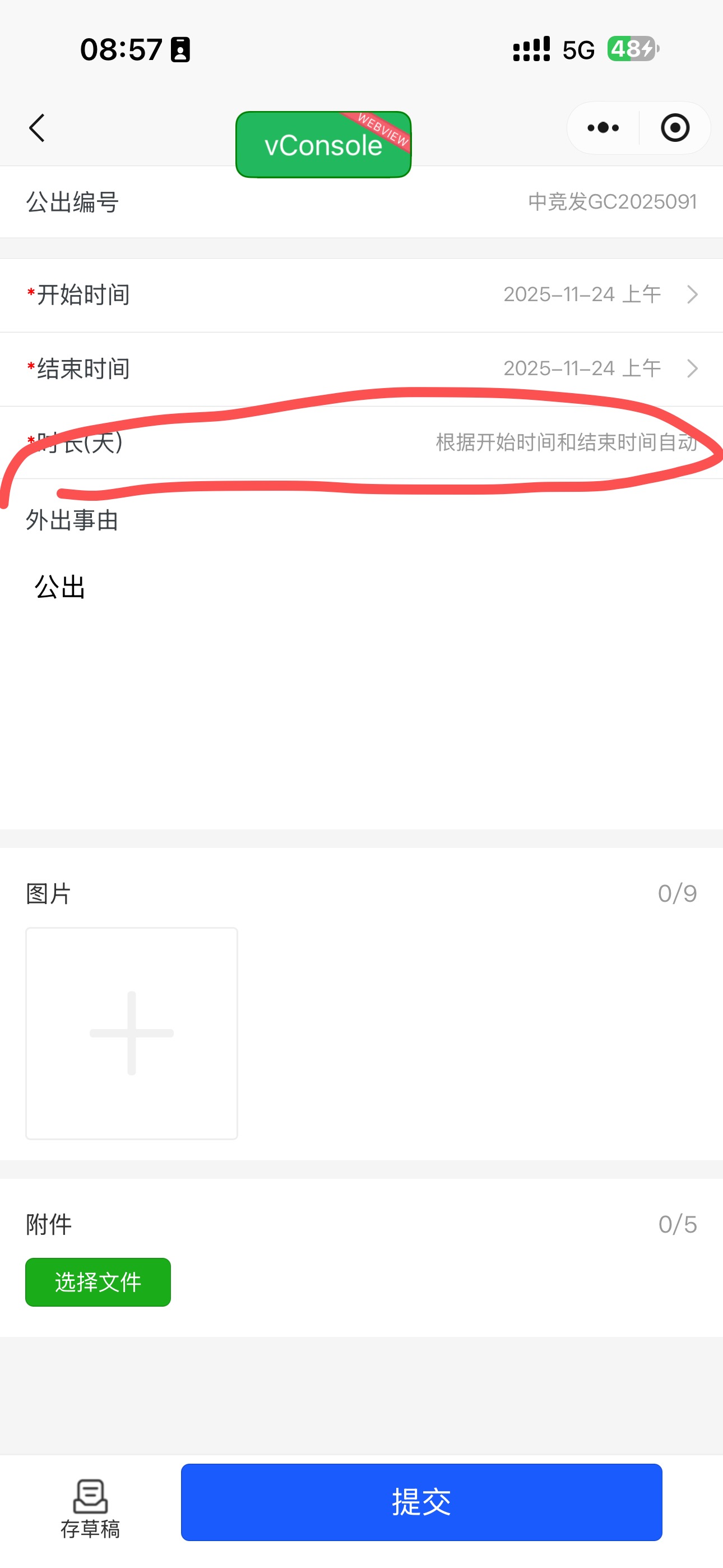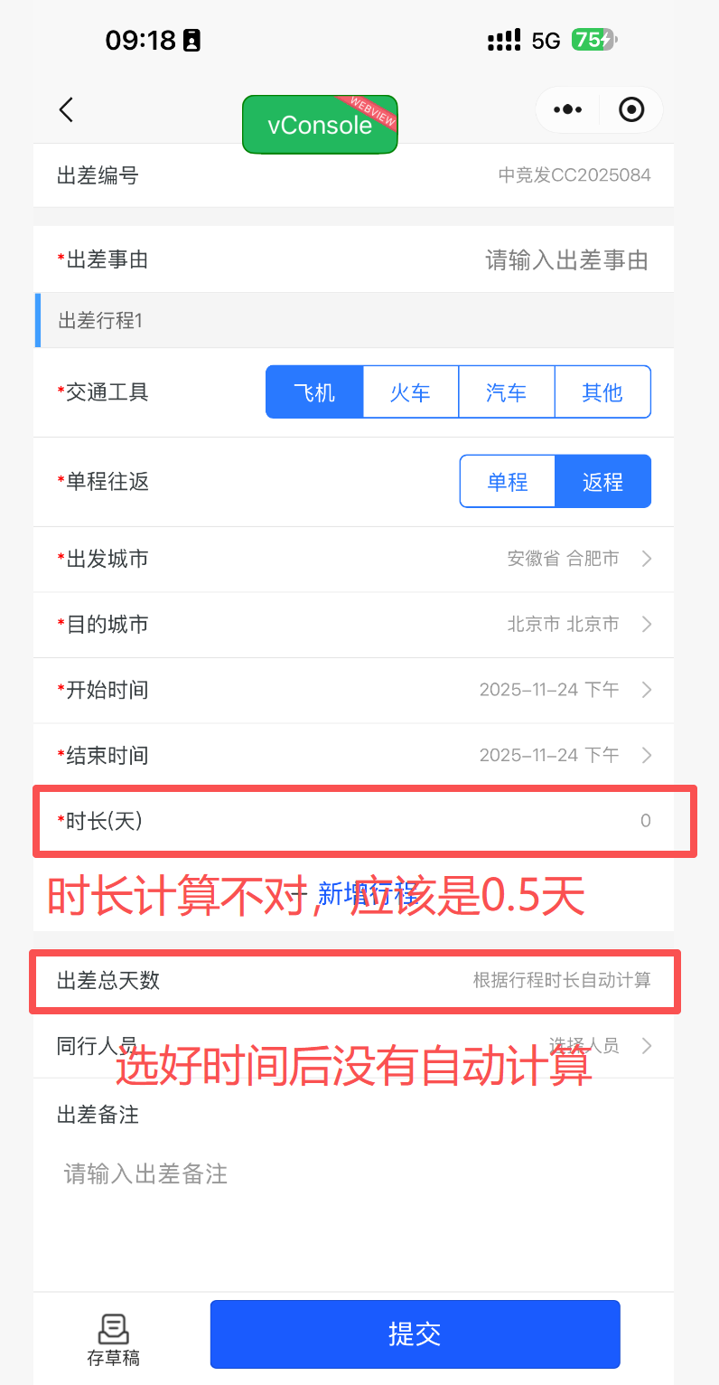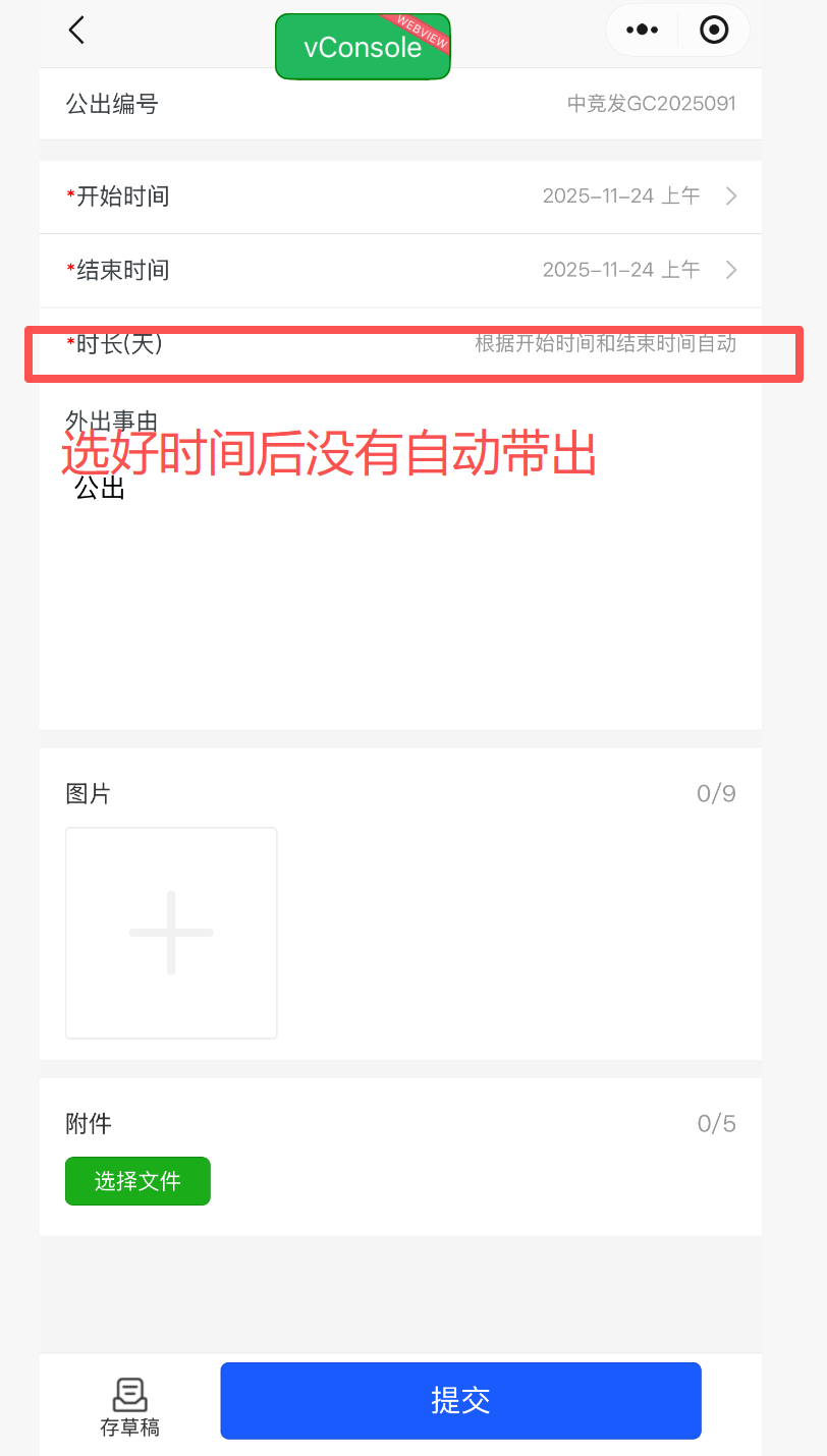小程序公出,出差申请,选了时间,时长没有自动带出