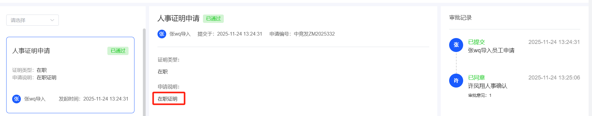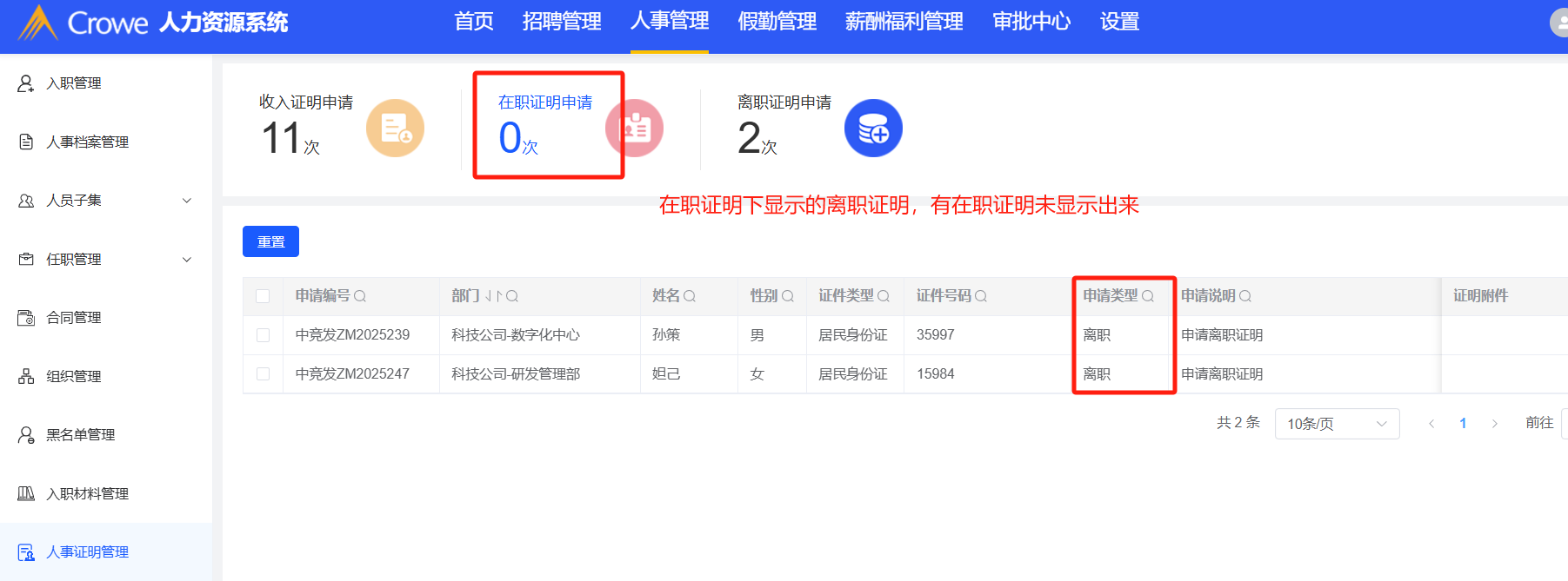 人事管理-人事证明管理:在职证明申请下数据显示错误