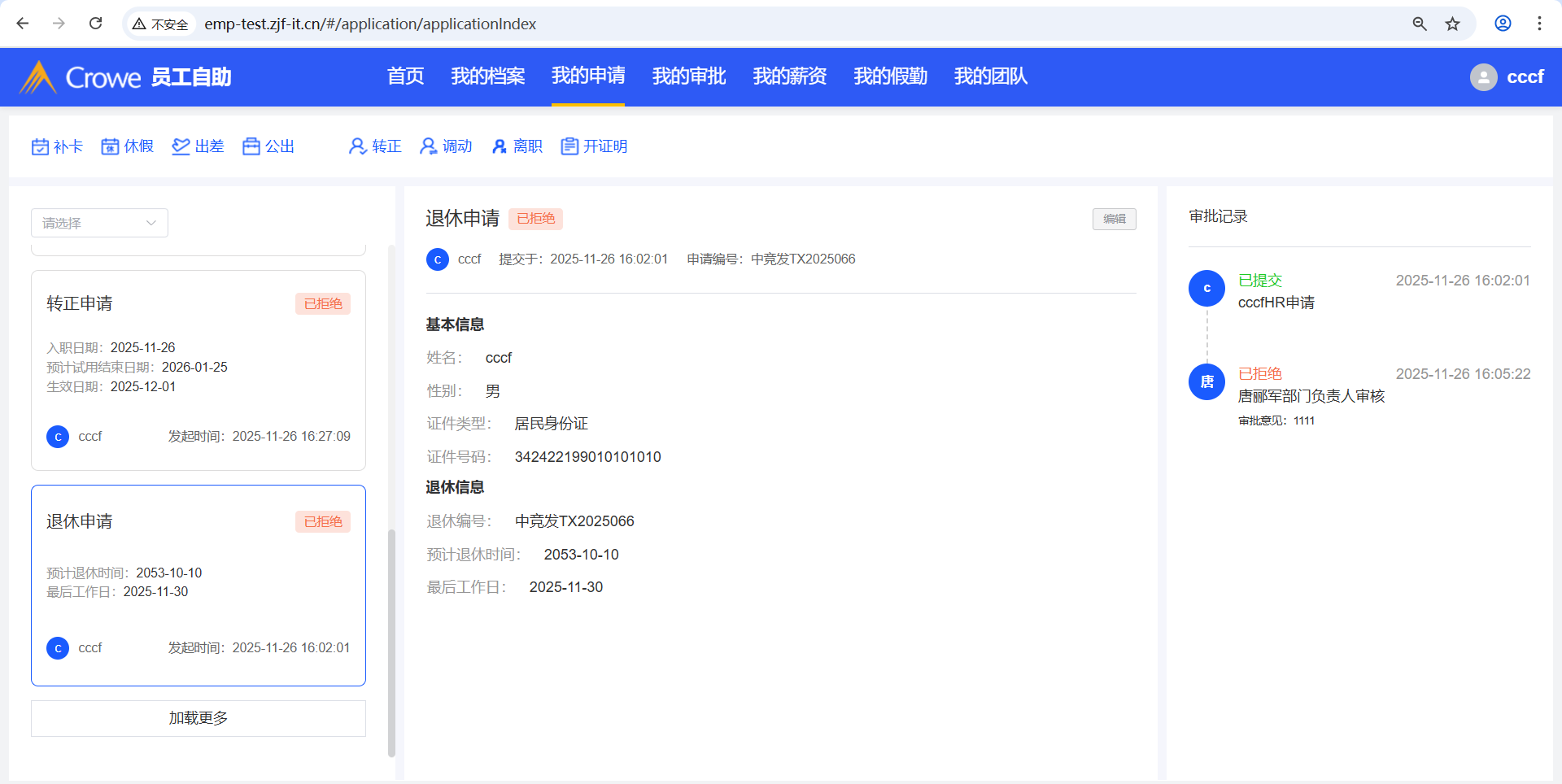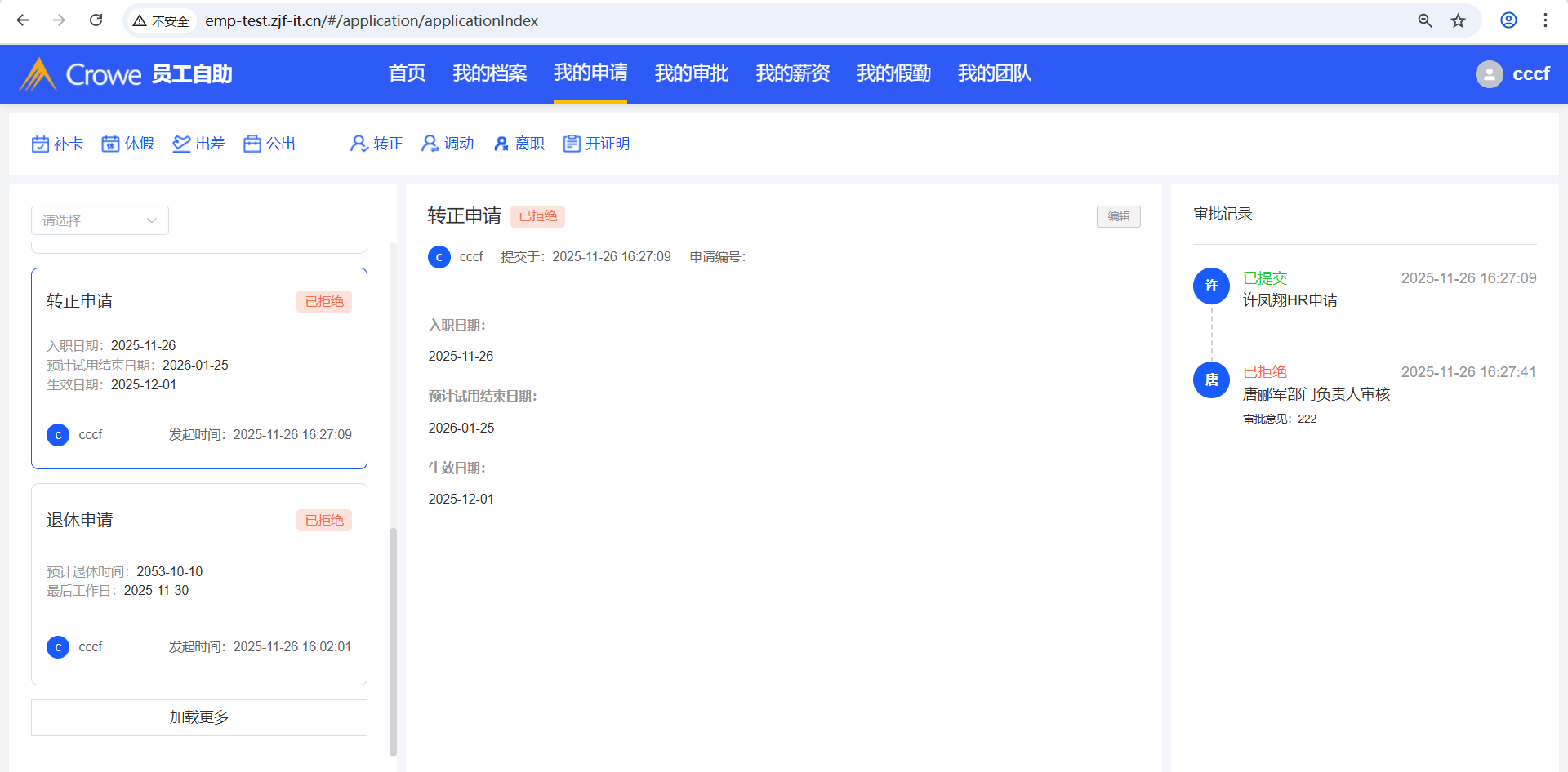 已关闭退休/转正申请-员工已拒绝,流程仍走到下一个审批人
