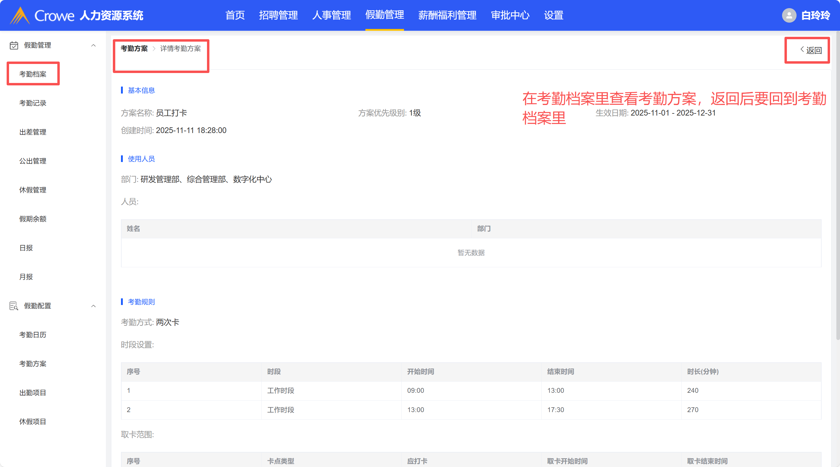从考勤档案里查看考勤方案,点返回要回到考勤档案里