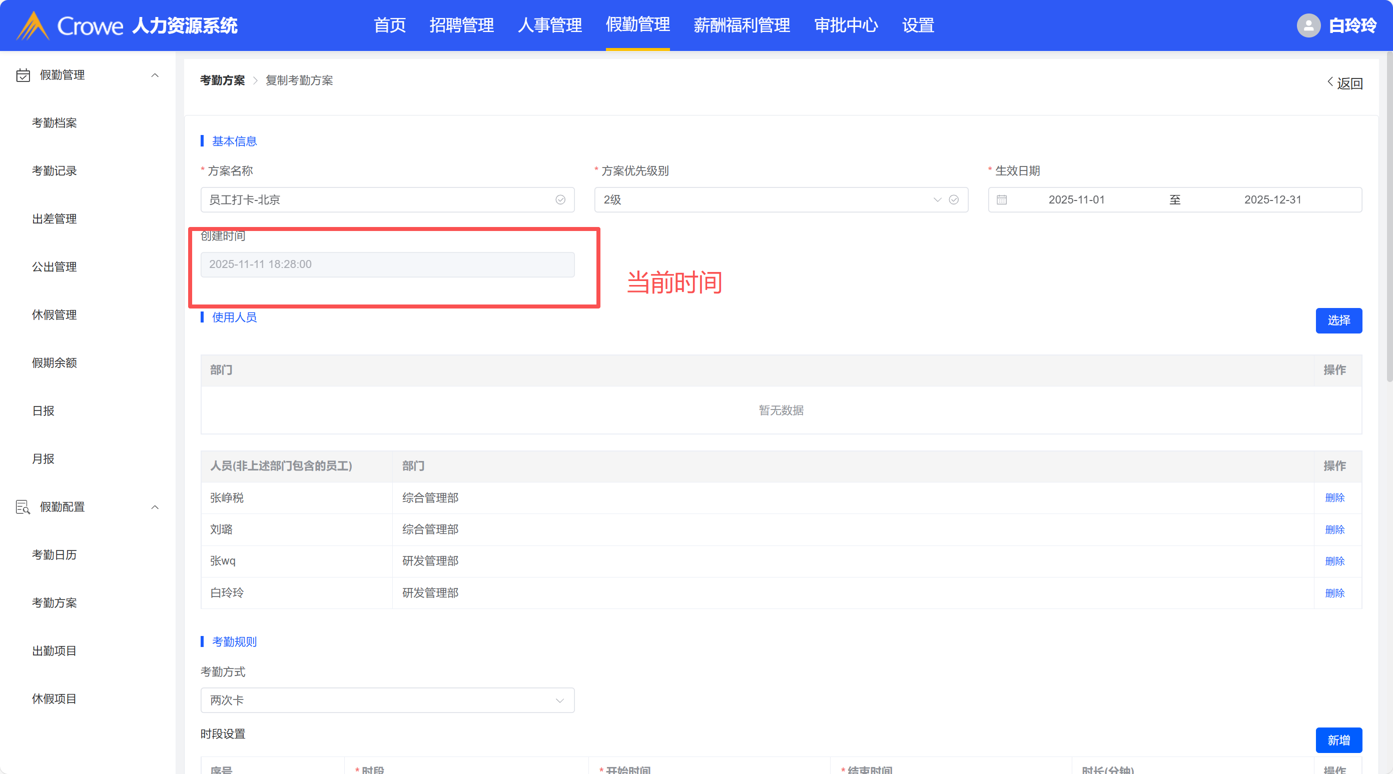 复制考勤方案,方案里的创建时间自动调整为当前时间