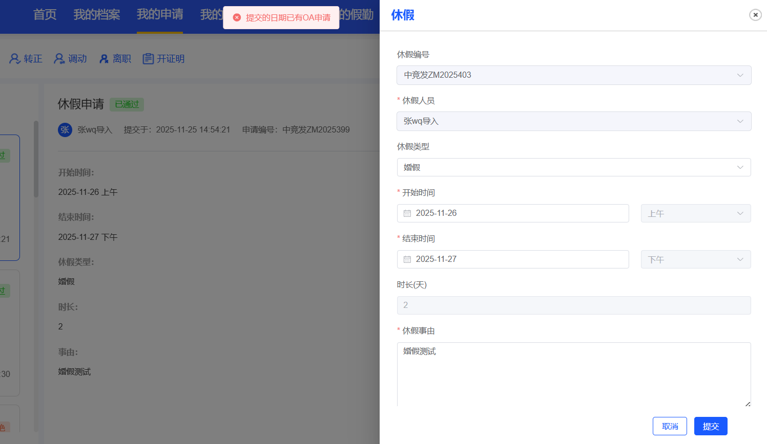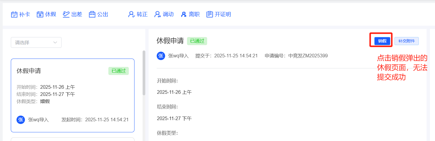 员工自助-休假申请:审批通过的休假申请,点击销假弹出休假界面