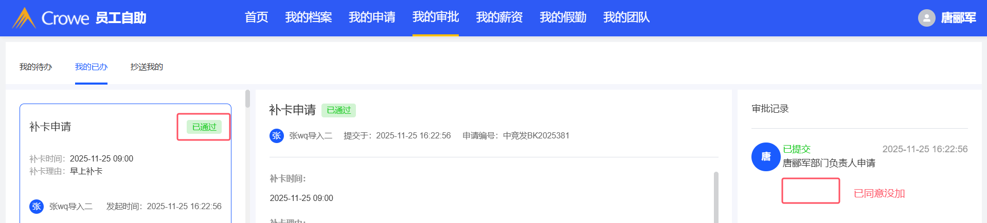 员工自助-我的团队-团队假勤-团队出勤:发起的补卡申请直接审批通过后,右侧流程中缺少已通过显示