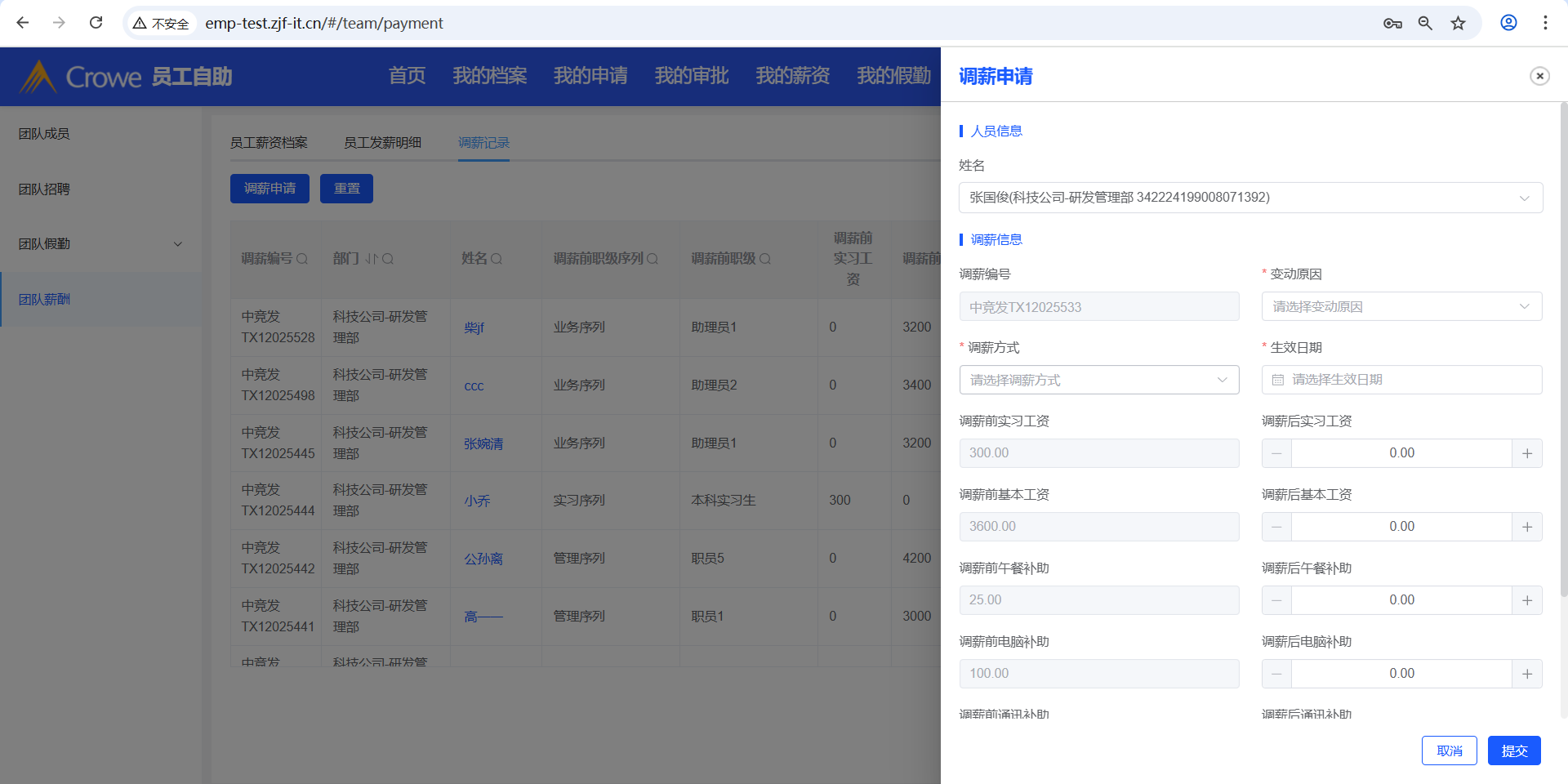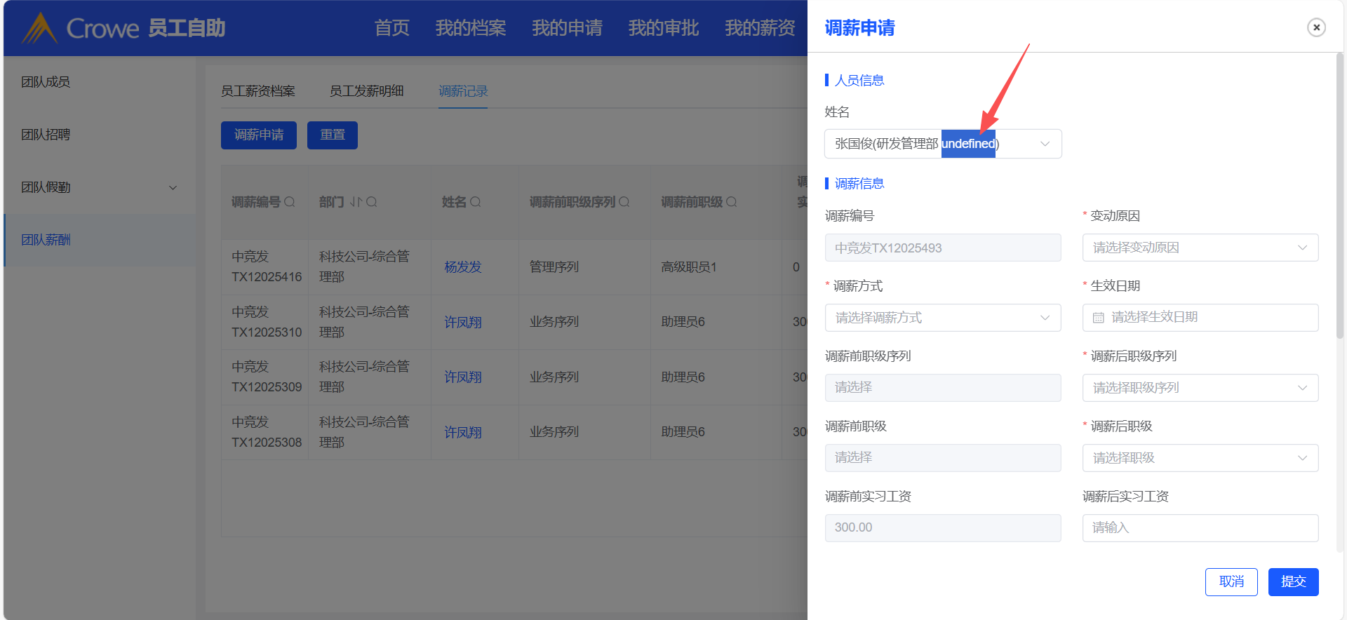 员工自助-我的团队-团队薪酬-调薪记录,点击调薪申请,选择姓名后,有undefined