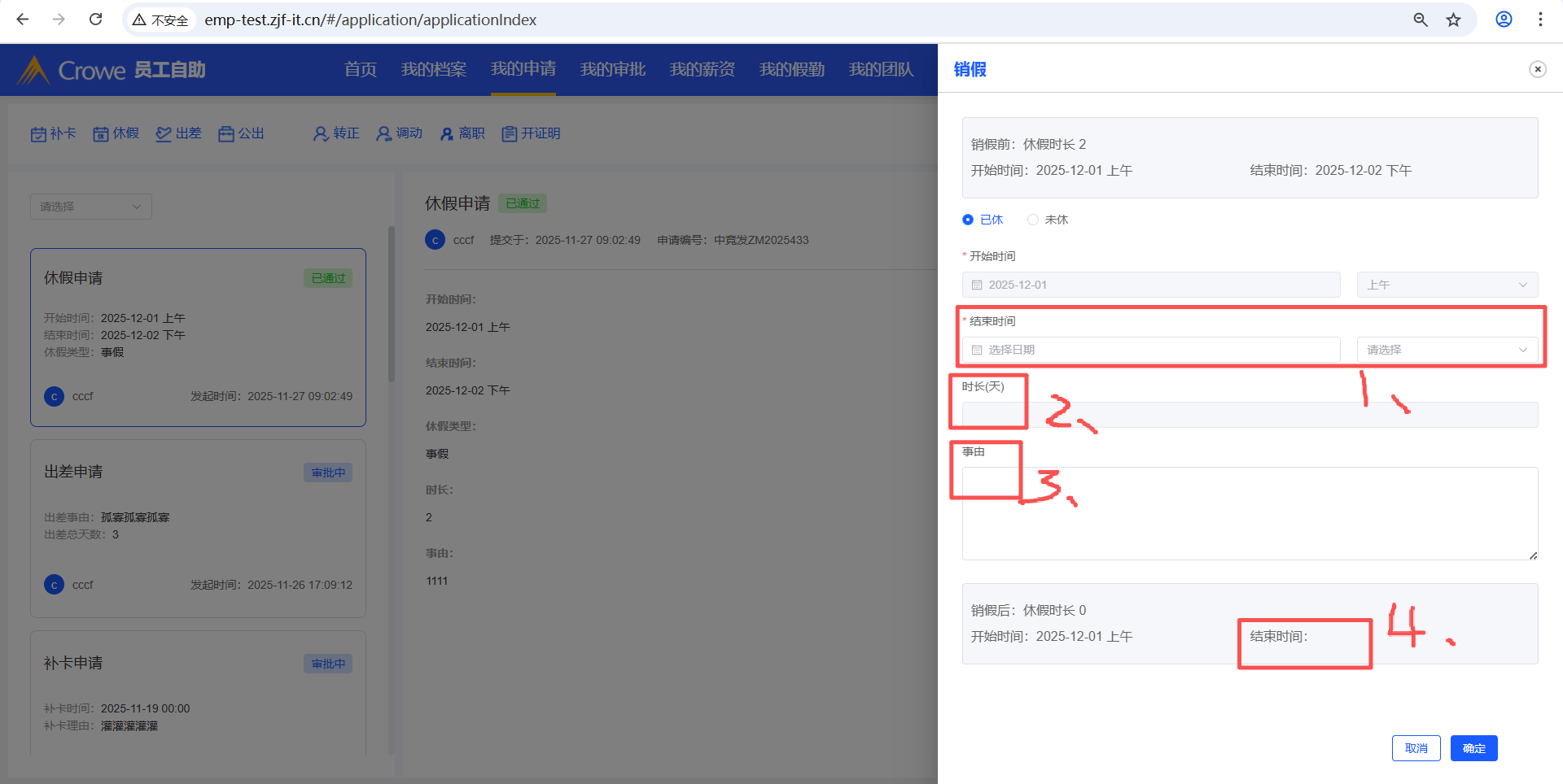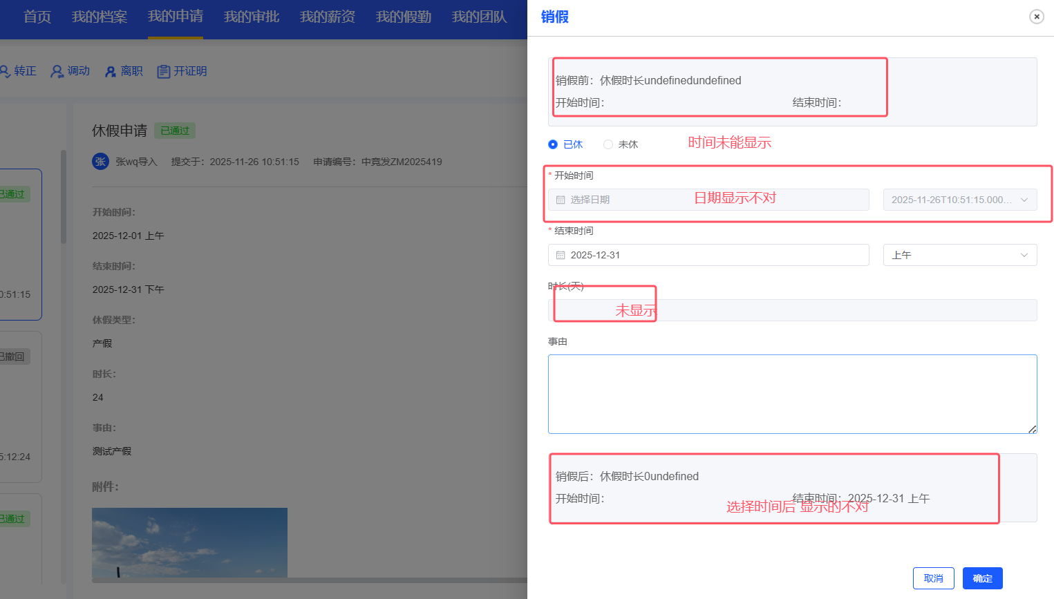 已关闭员工自助-休假申请:审批通过的休假申请,点击销假后弹出页面中数据显示不对