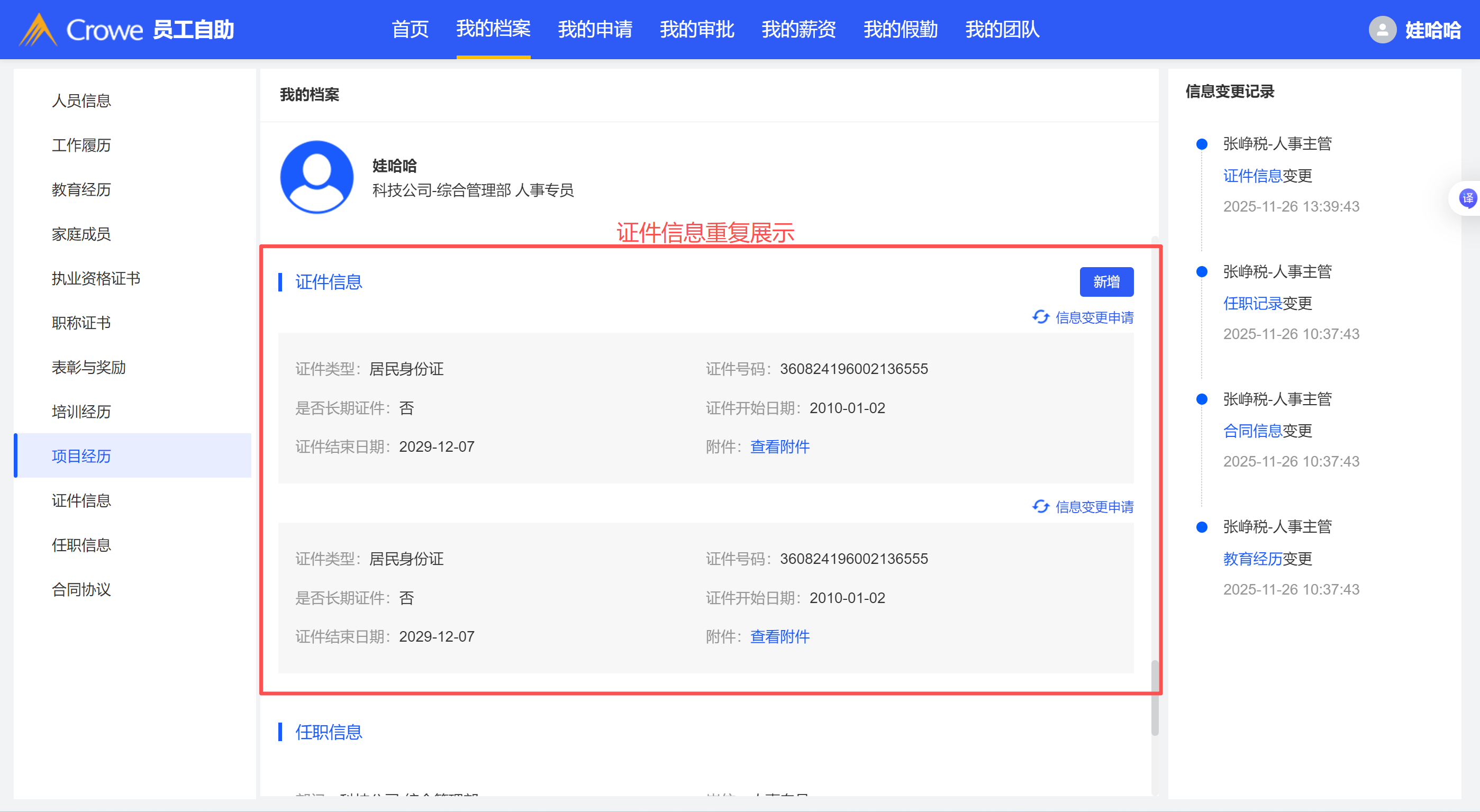 招聘过来的人员,我的档案证件信息展示重复