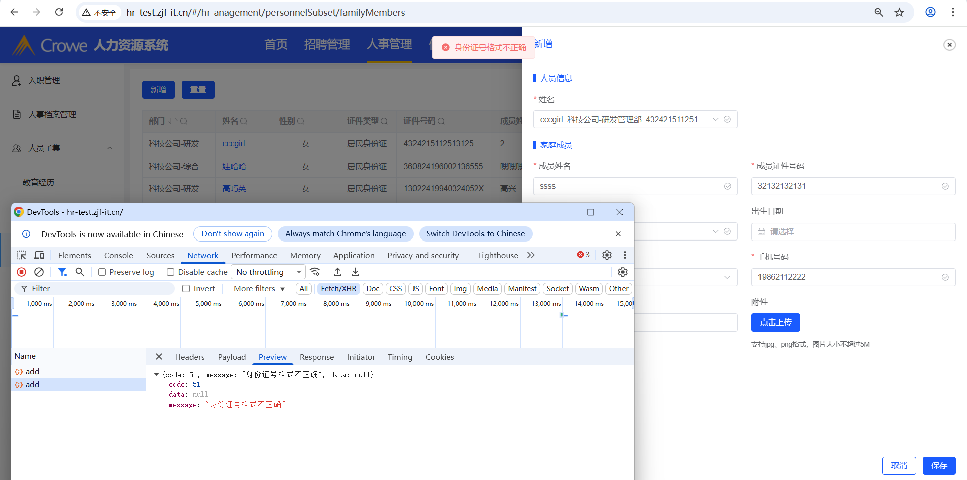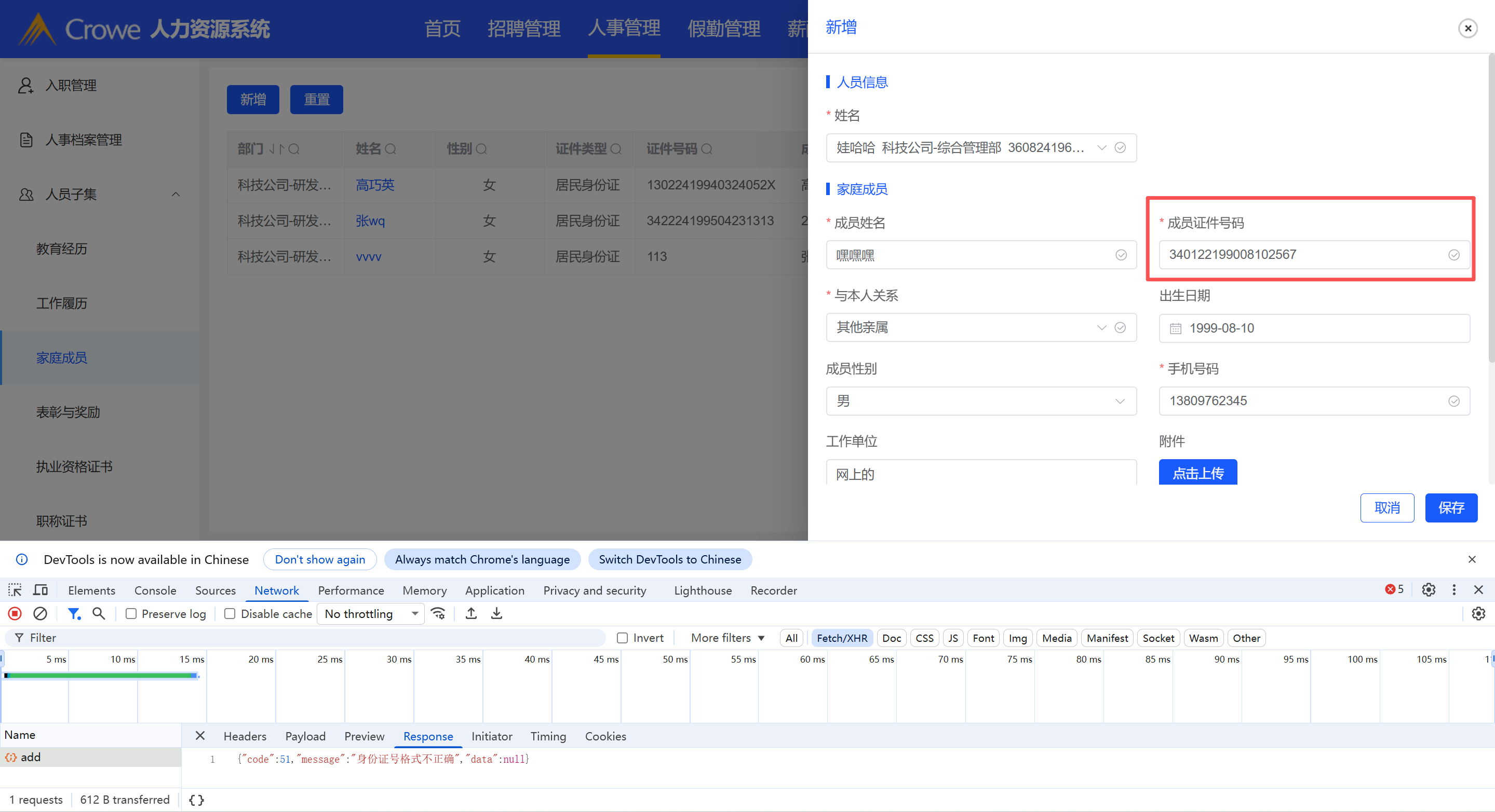家庭成员-新增家庭成员信息提示身份证号格式不正确