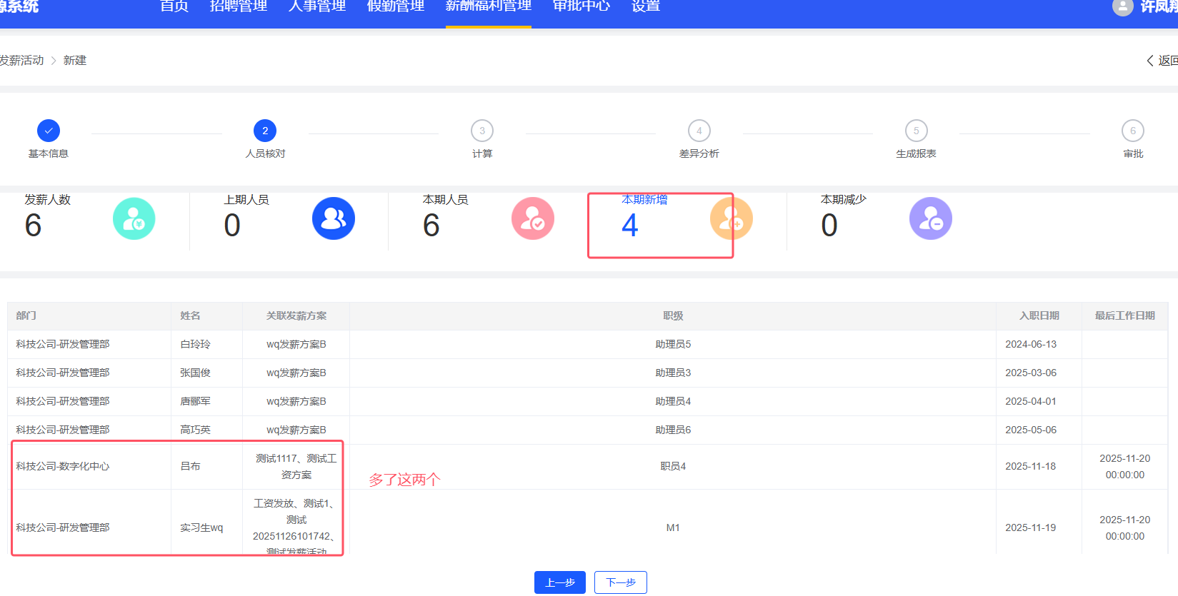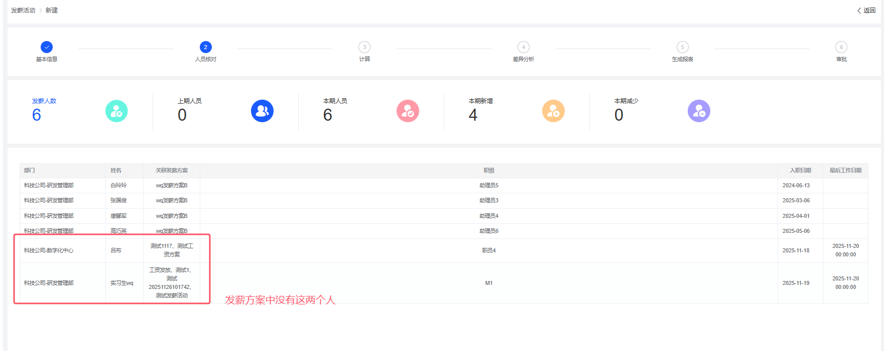 发薪活动:人员核对页,发薪活动及本期新增人员显示有误