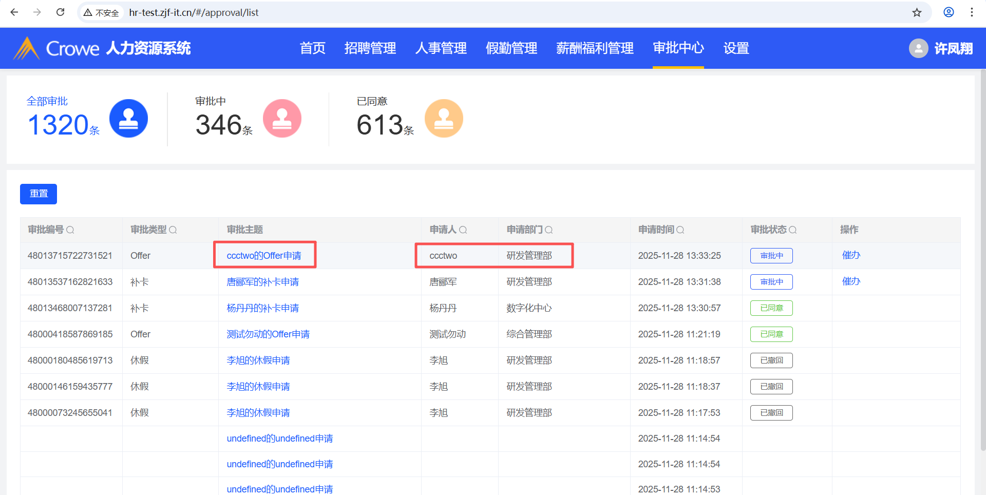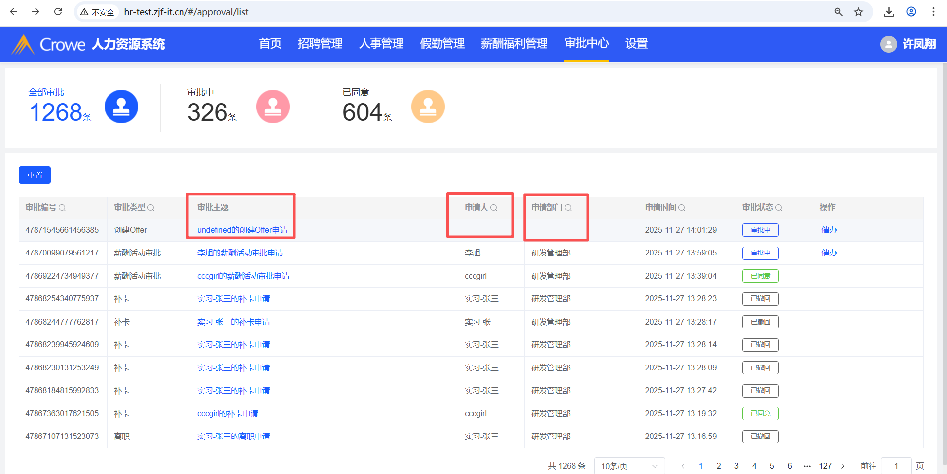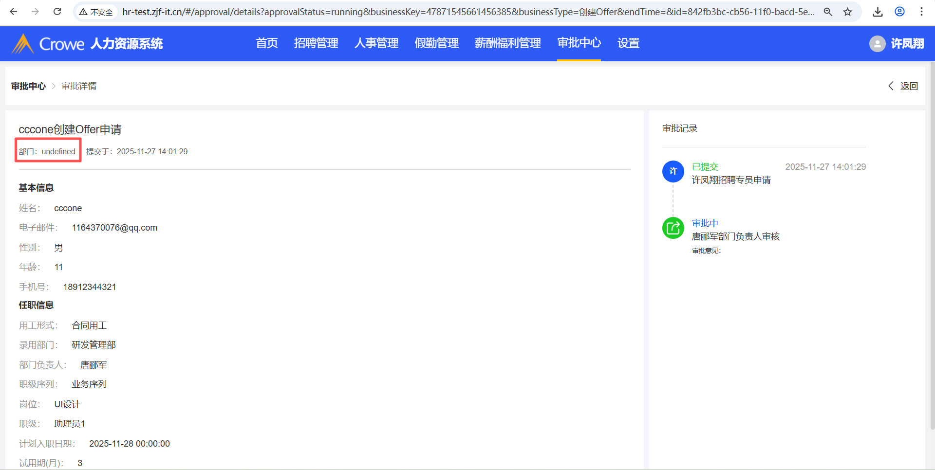 已关闭人力资源系统-招聘管理-offer管理,创建offer后,在审批中心菜单,审批主题、申请人、申请部门、审批详情的部门,显示有误