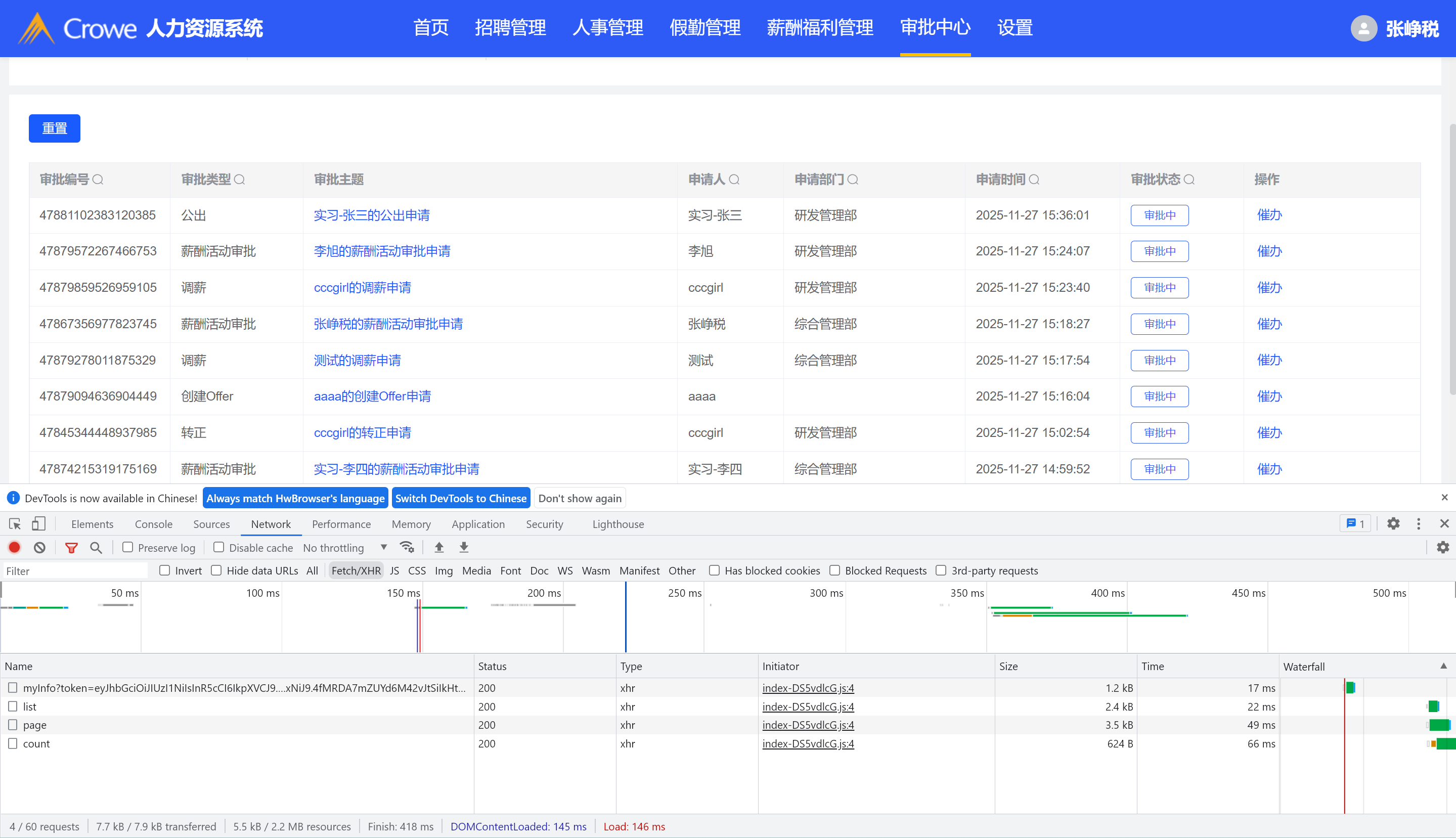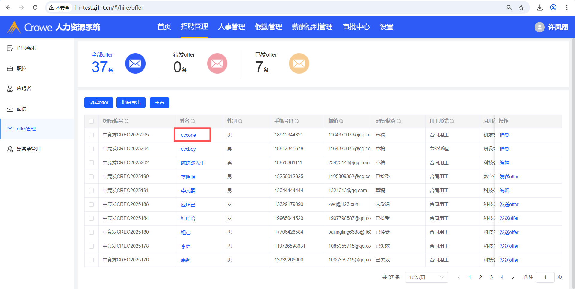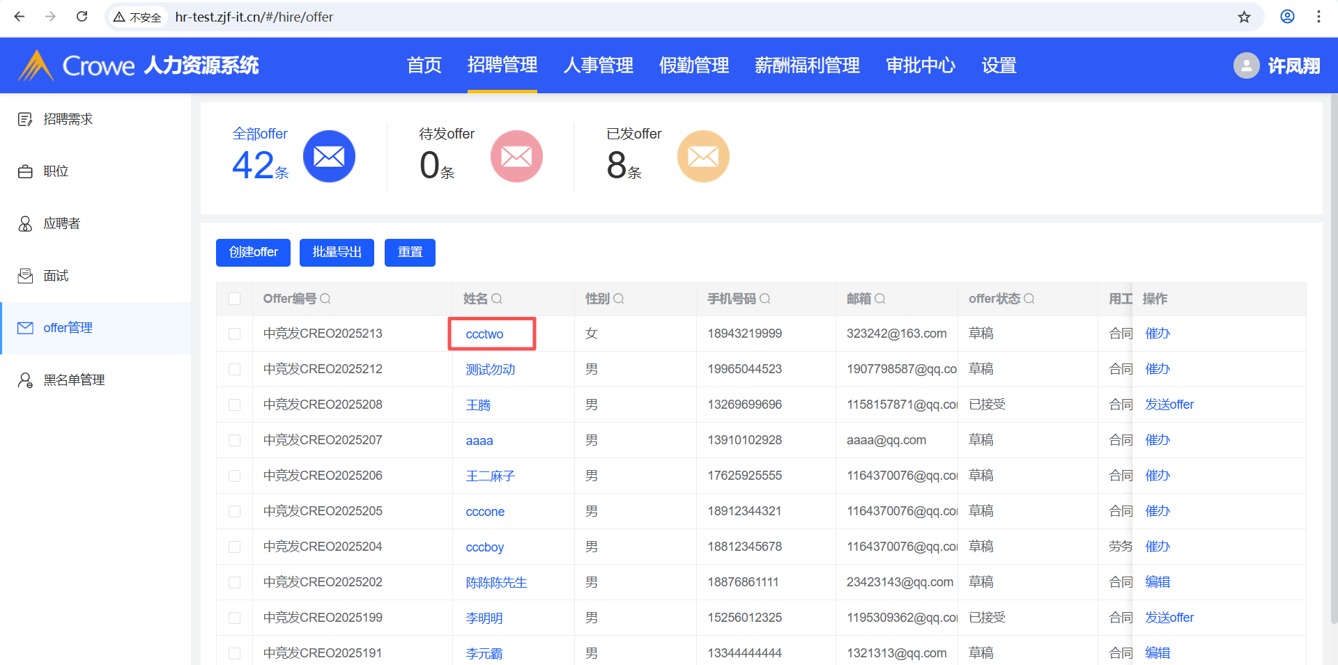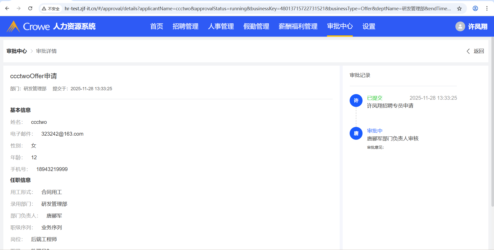 已关闭人力资源系统-招聘管理-offer管理,创建offer后,在审批中心菜单,审批主题、申请人、申请部门、审批详情的部门,显示有误