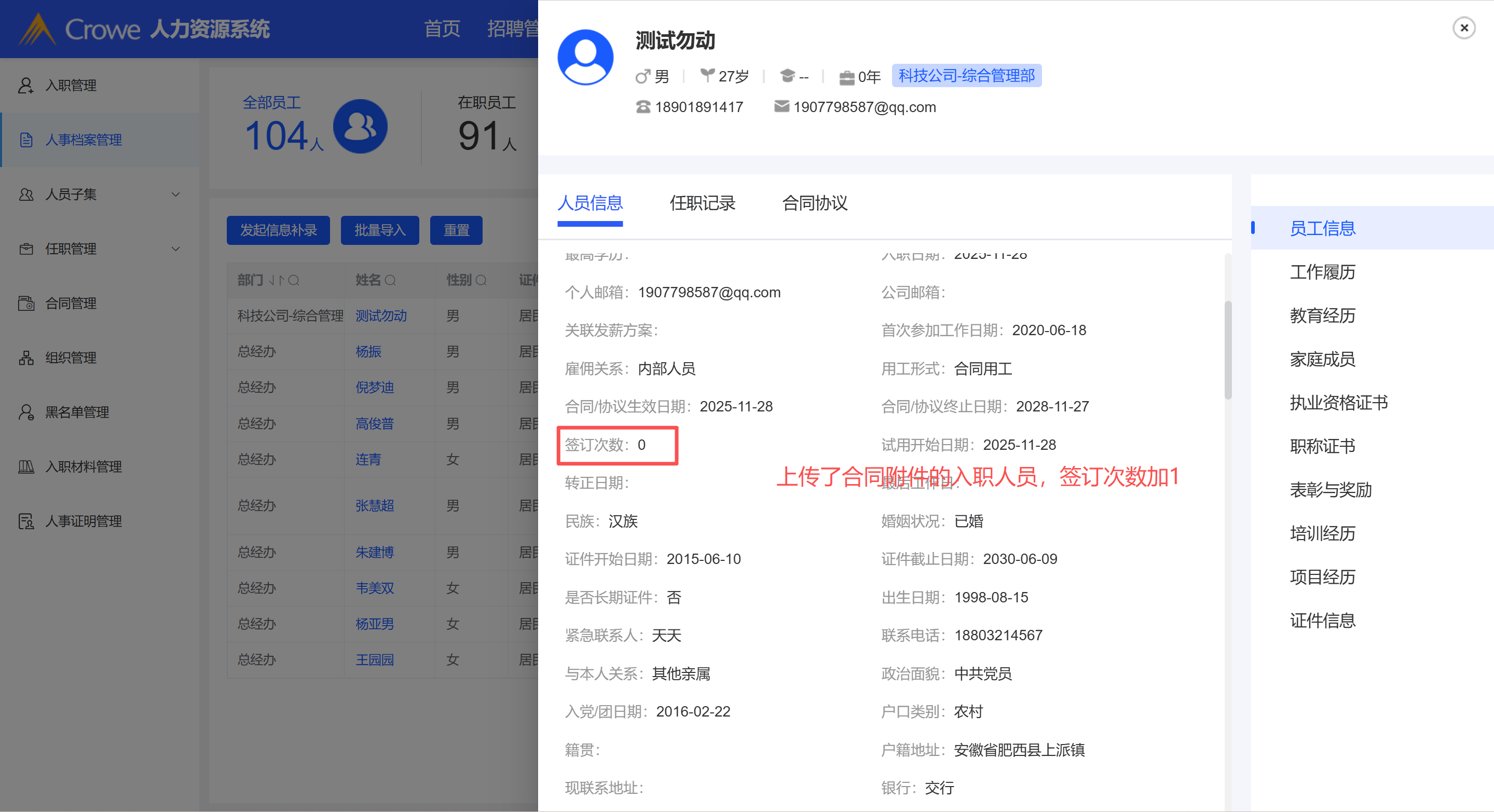 招聘入职上传了纸质合同,人事档案展示合同签订次数为1