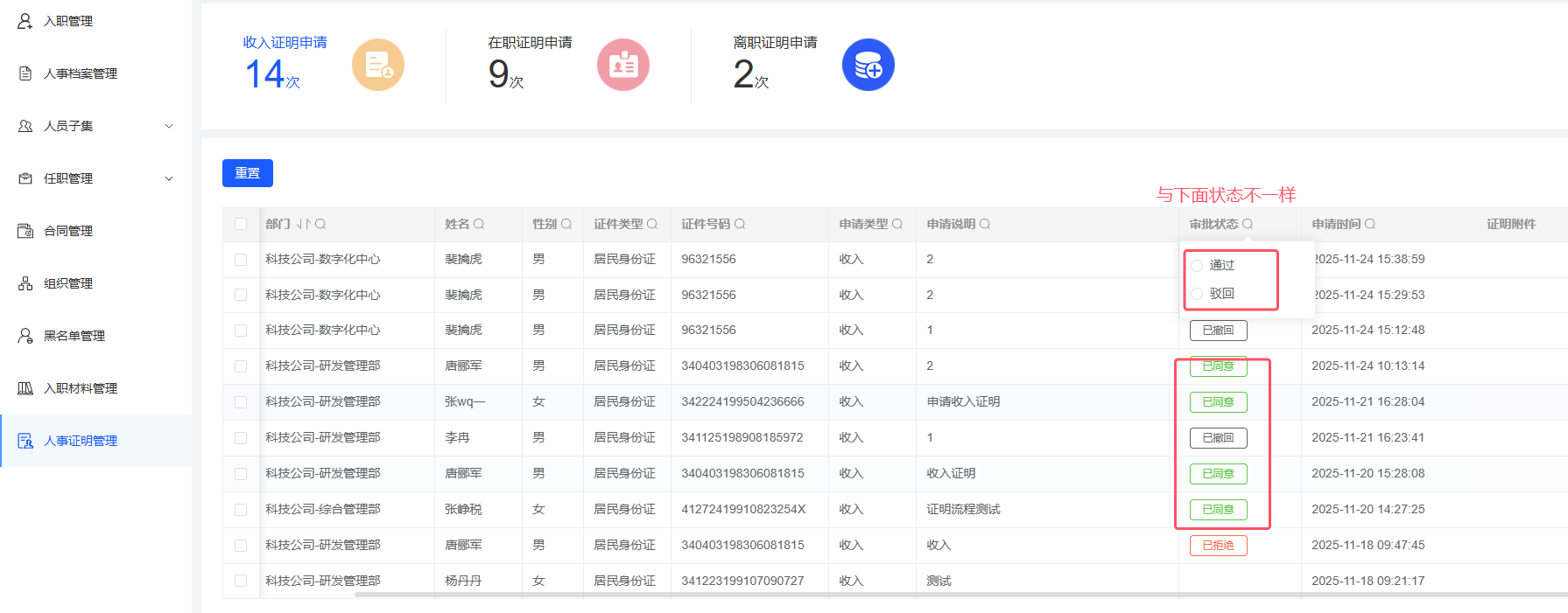 人事证明管理:审批状态筛选项展示的与下方实际状态不符