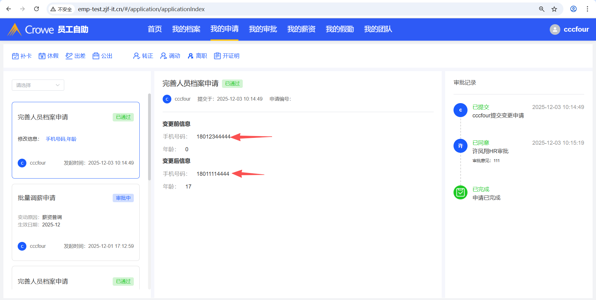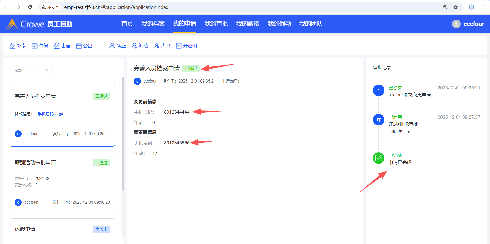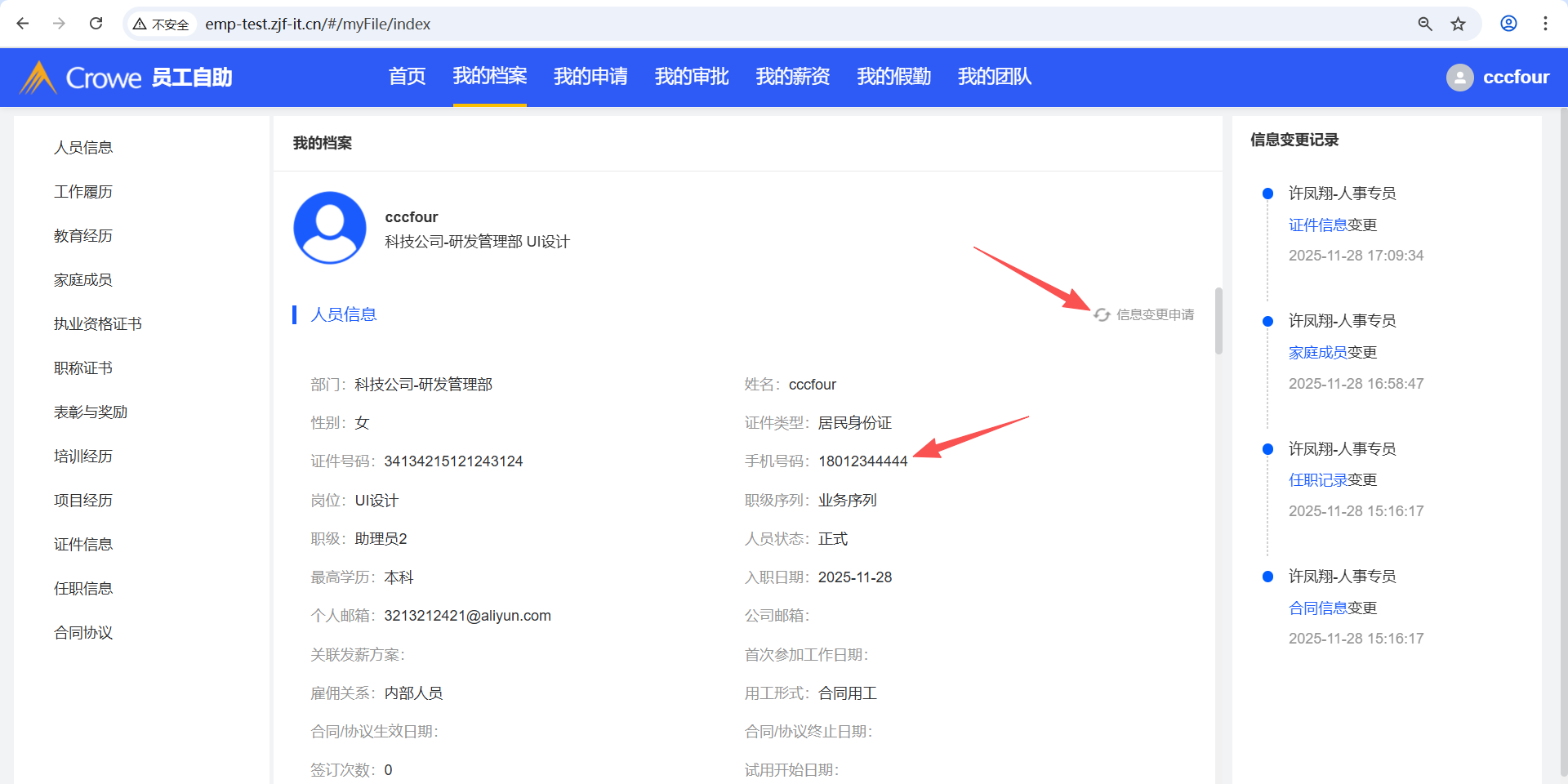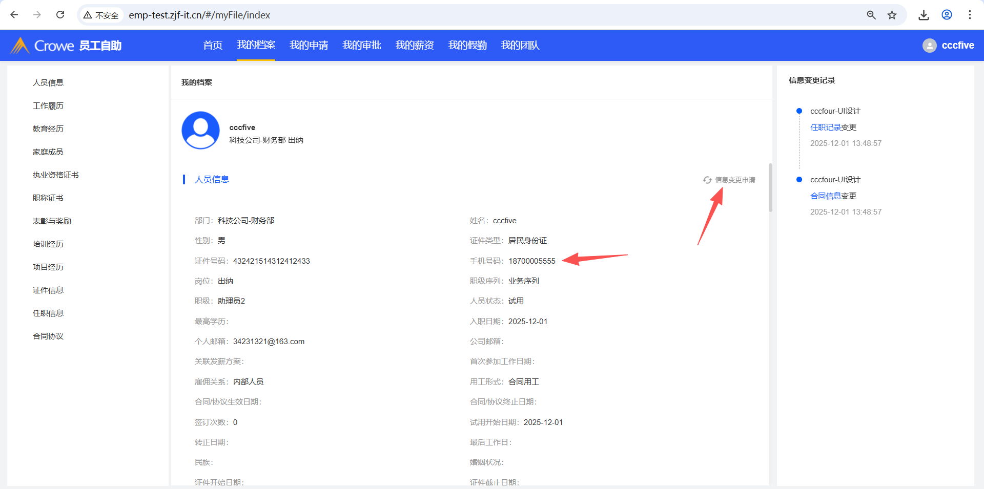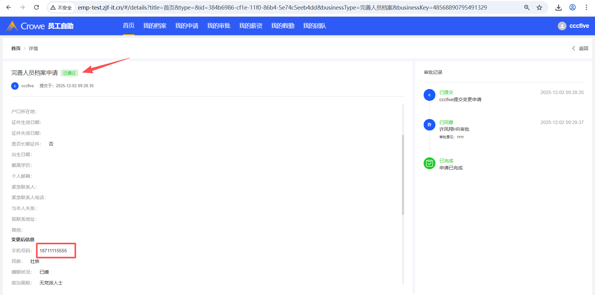 员工自助-我的档案-人员信息,信息变更申请修改数据,审核通过后,重新查看人员信息,数据未更新