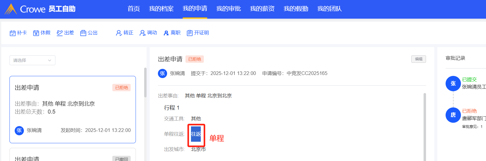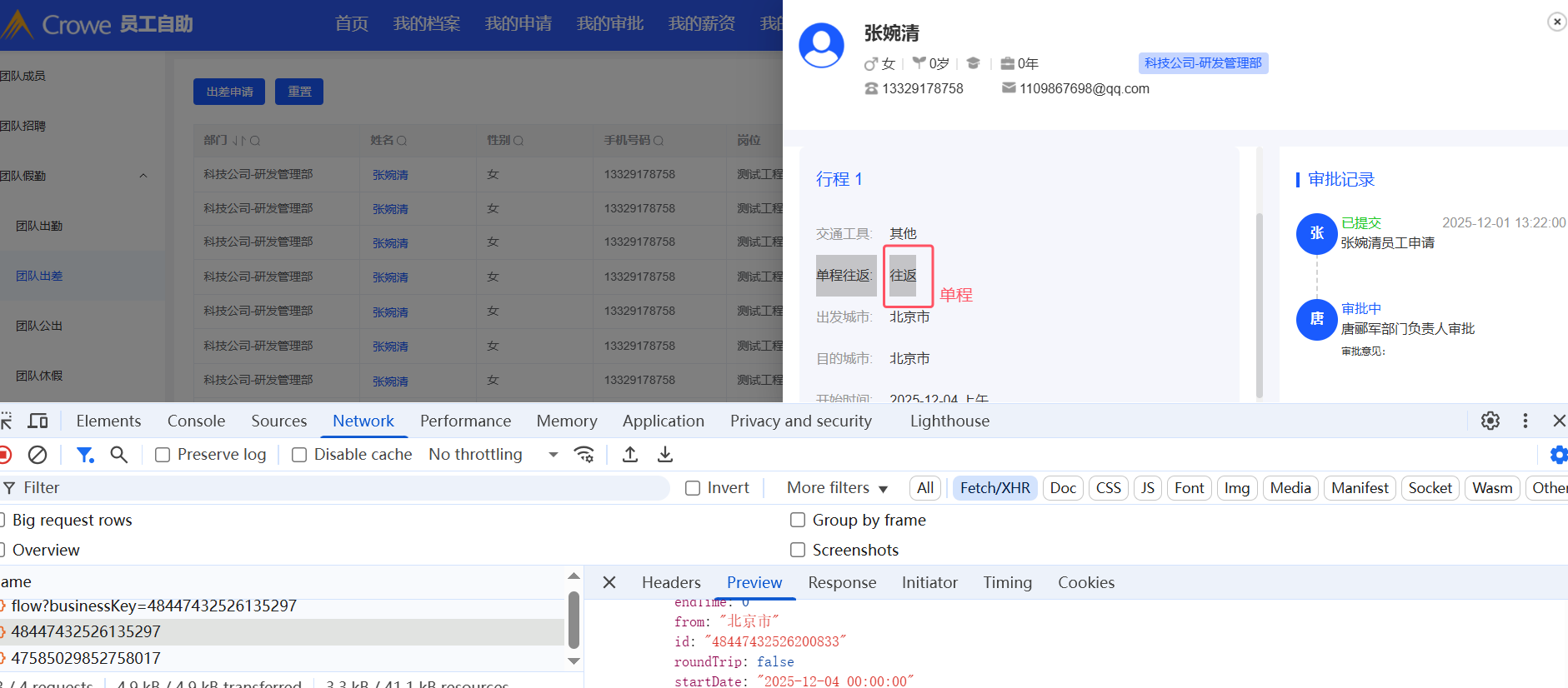 员工自助-我的申请-出差申请:出差申请中,单程往返字段数据显示错误