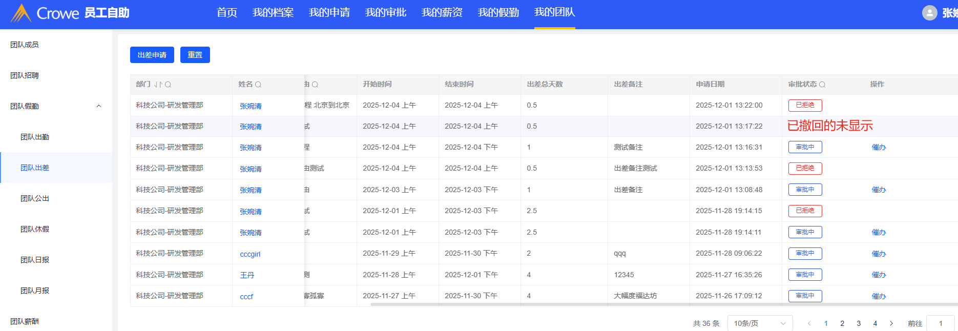 员工自助-我的团队-团队出差:已撤回状态未显示