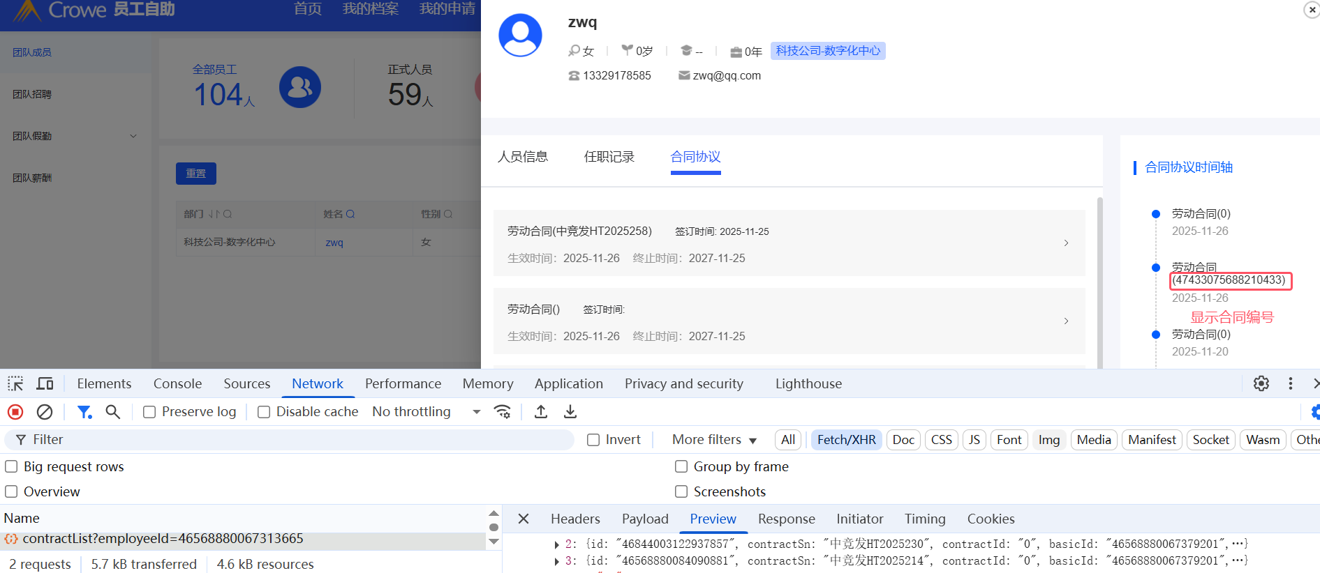 员工自助-我的团队-团队成员:合同协议时间轴中应显示合同编号
