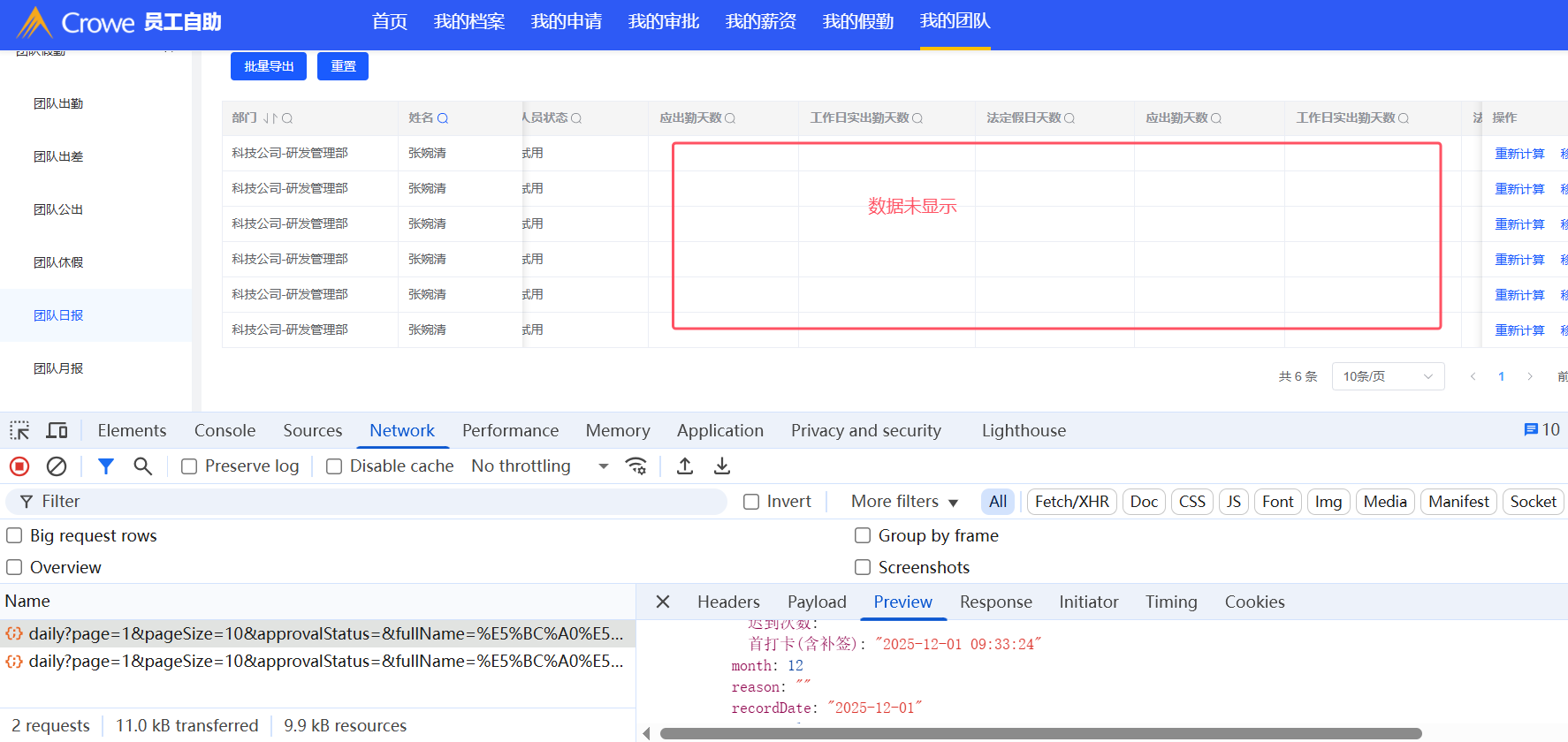 我的团队-团队日报:应出勤天数等数据未显示