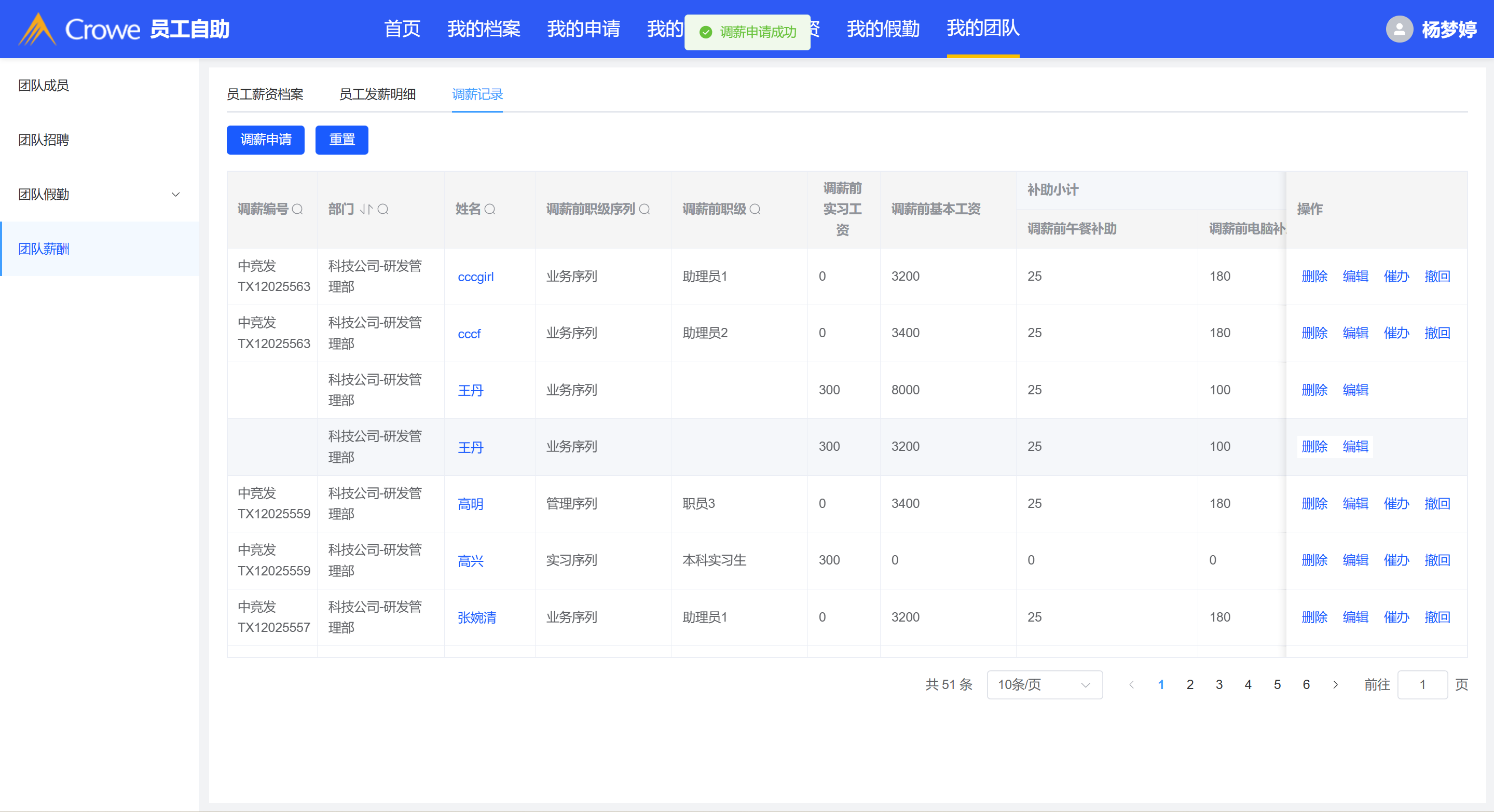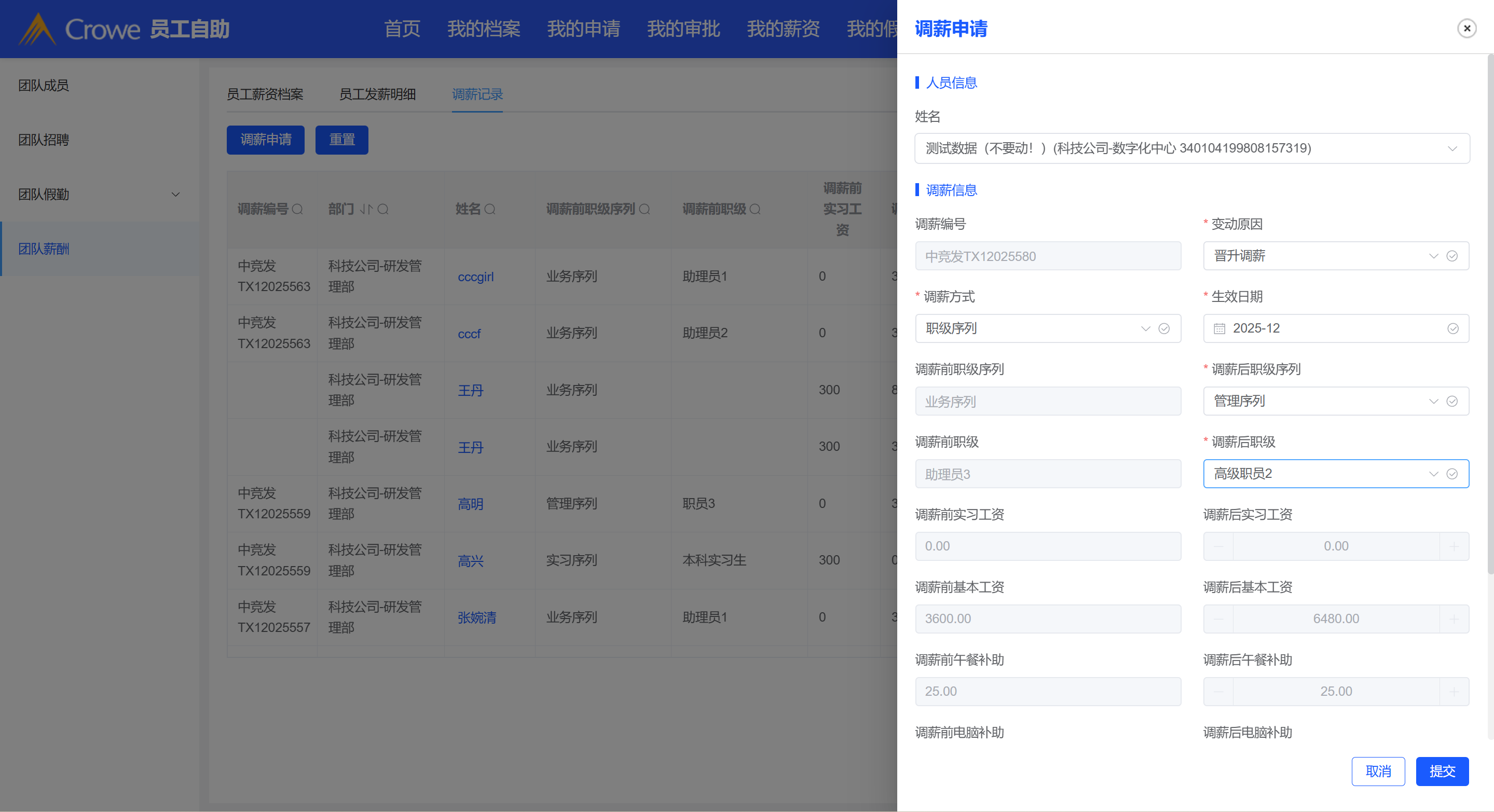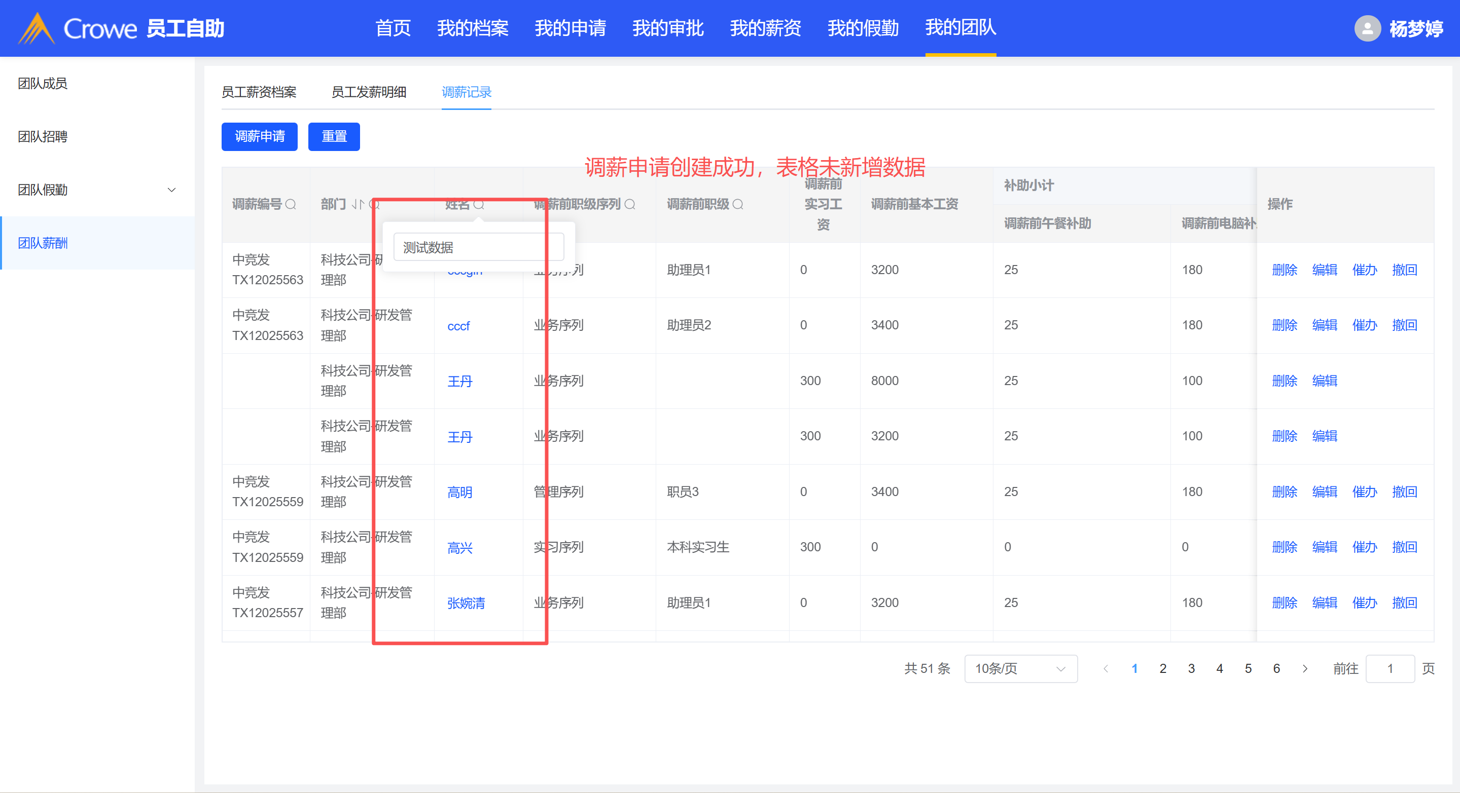 创建成功的调薪申请,表格未见该数据