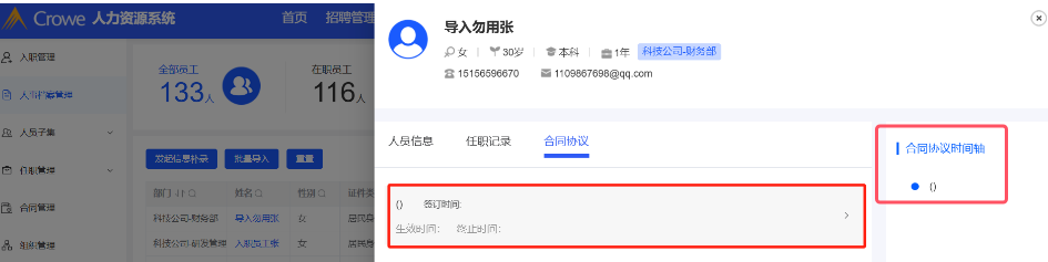 人事档案管理-合同协议:导入的人员,点击姓名查看合同协议,数据展示异常