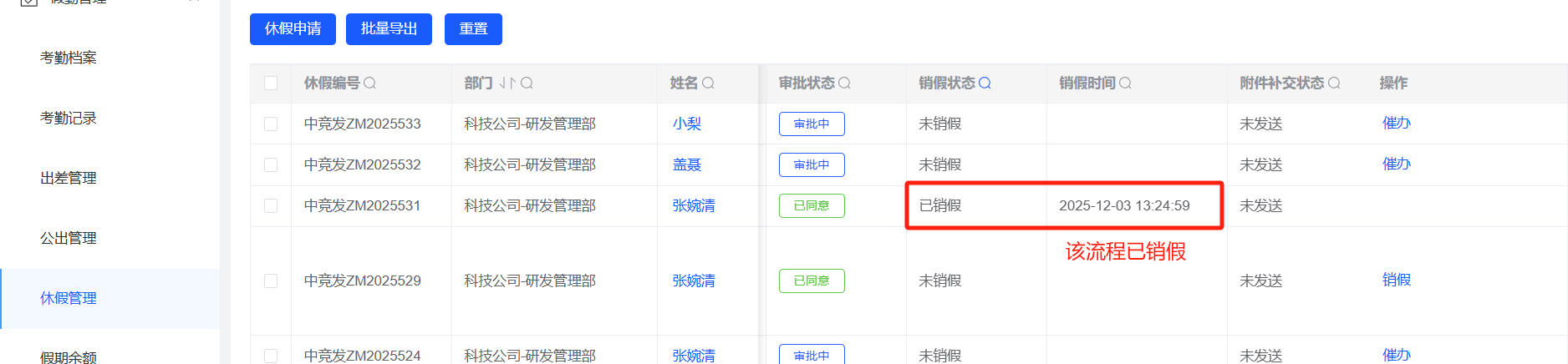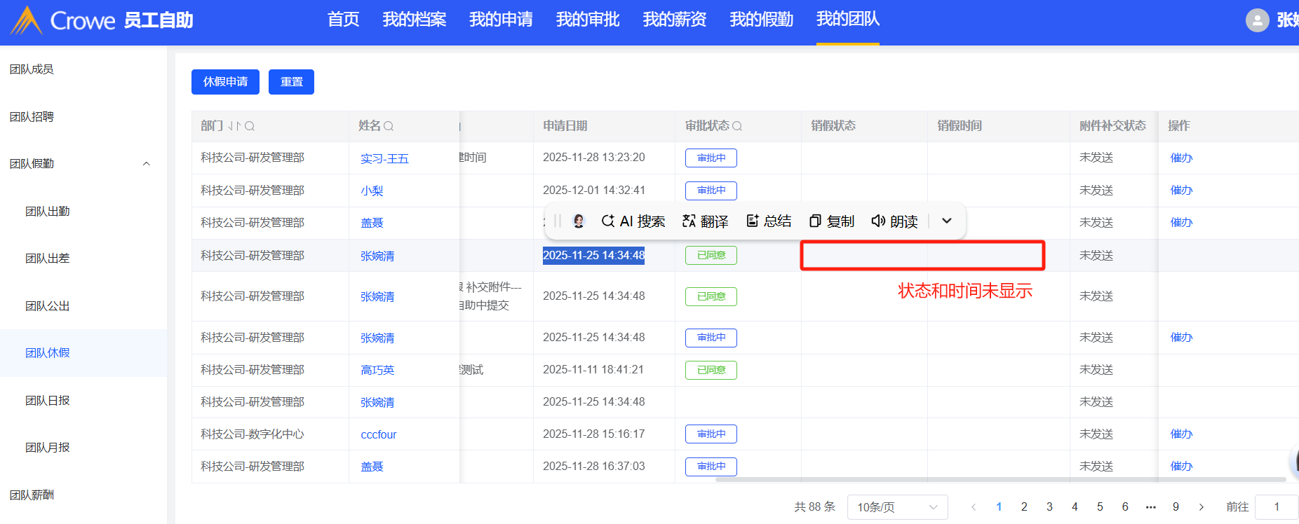 员工自助-我的团队-团队休假:销假状态和销假时间未显示