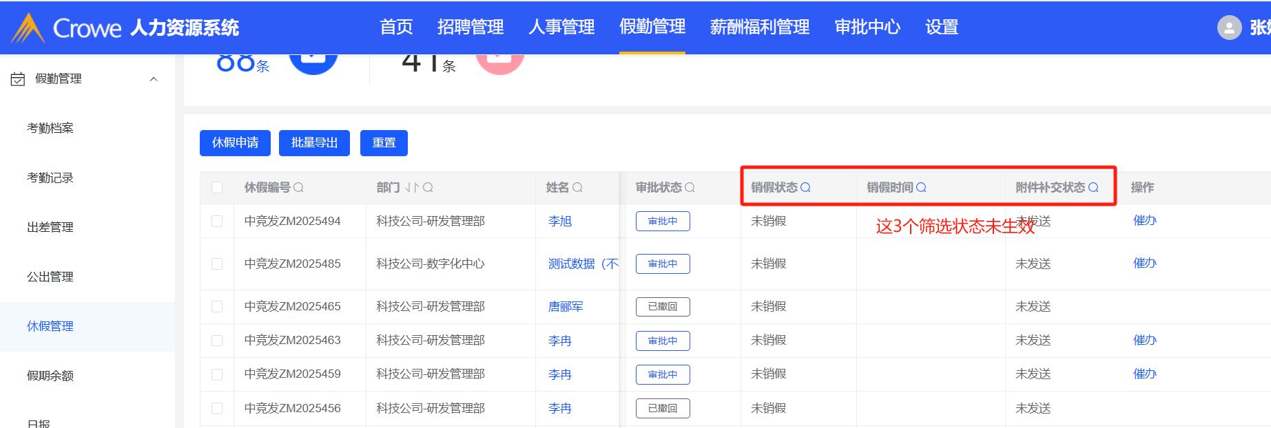 假勤管理-休假管理:销假状态、销假时间、附件补交状态筛选未生效