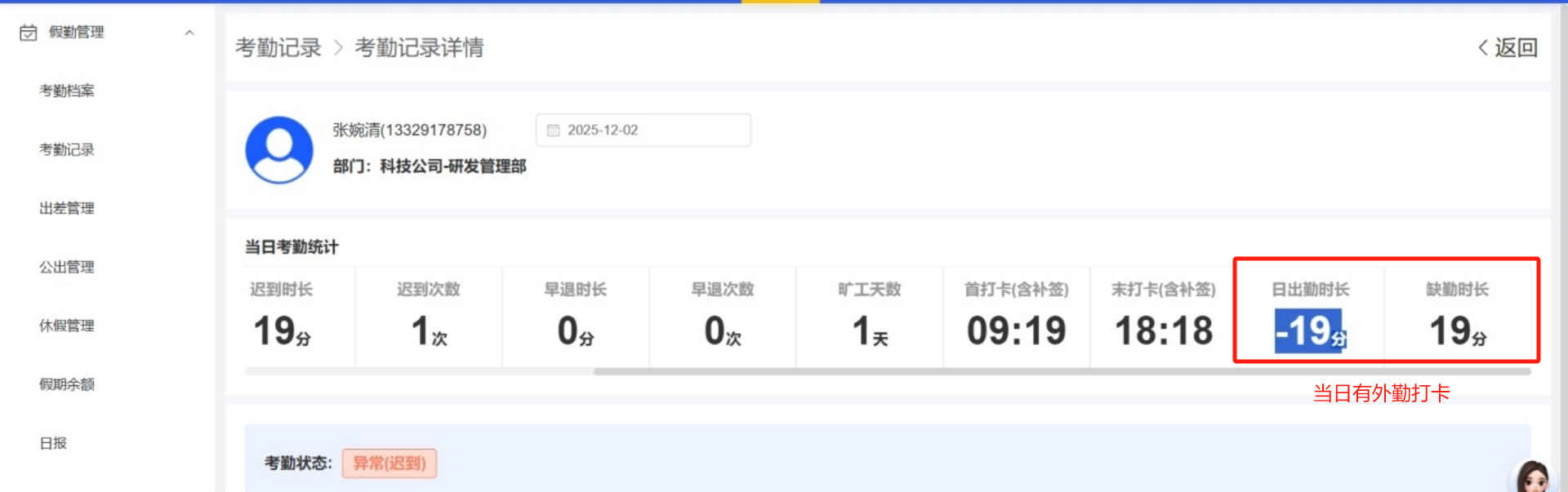 假勤管理-考勤记录-考勤记录详情:外勤打卡时,日出勤时长和缺勤时长统计错误