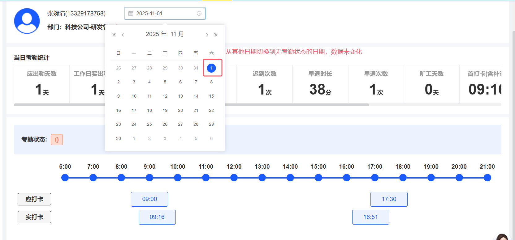 假勤管理-考勤记录-考勤记录详情:从有考勤记录的日期切换到其他无考勤记录的日期,数据无变化