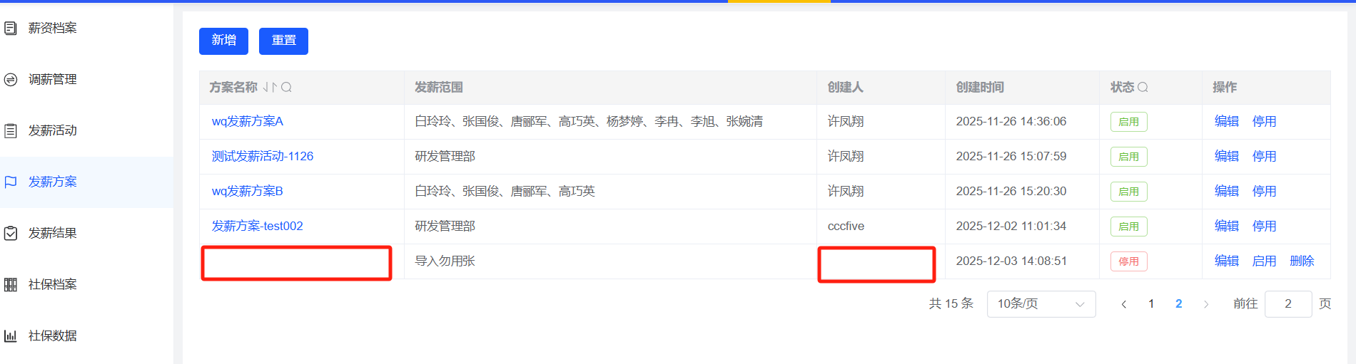发薪方案-发薪方案停用后,方案名称和创建人显示空白