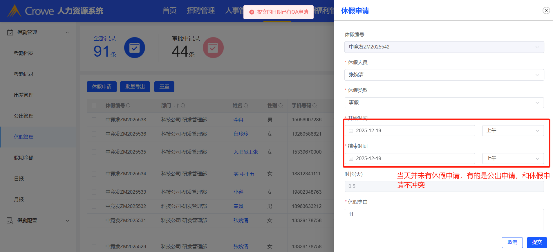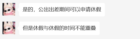 休假申请:公出/出差的时间段提出休假申请限制了,公出/出差期间可以休假