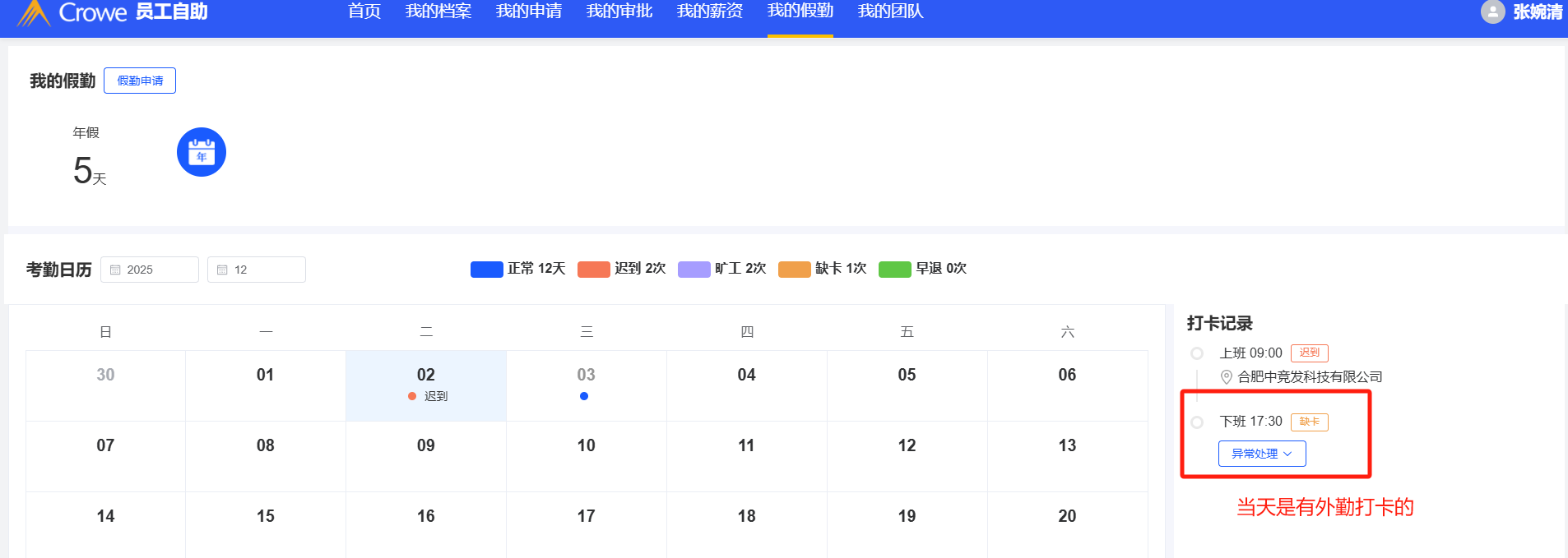 员工自助-我的假勤:考勤日历当天有外勤打卡的未显示
