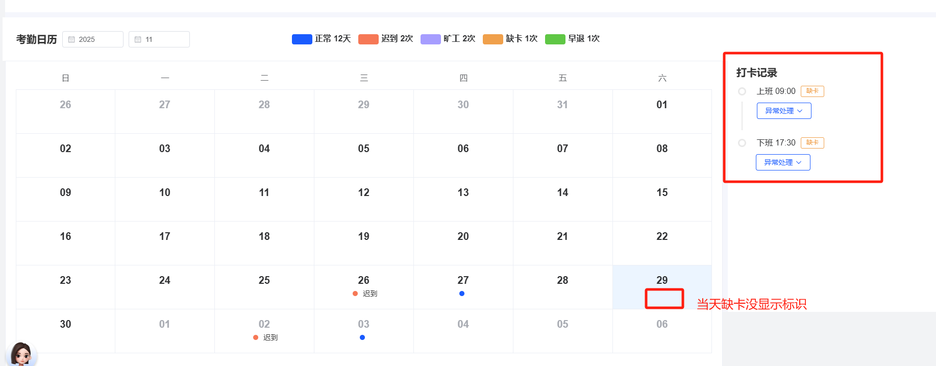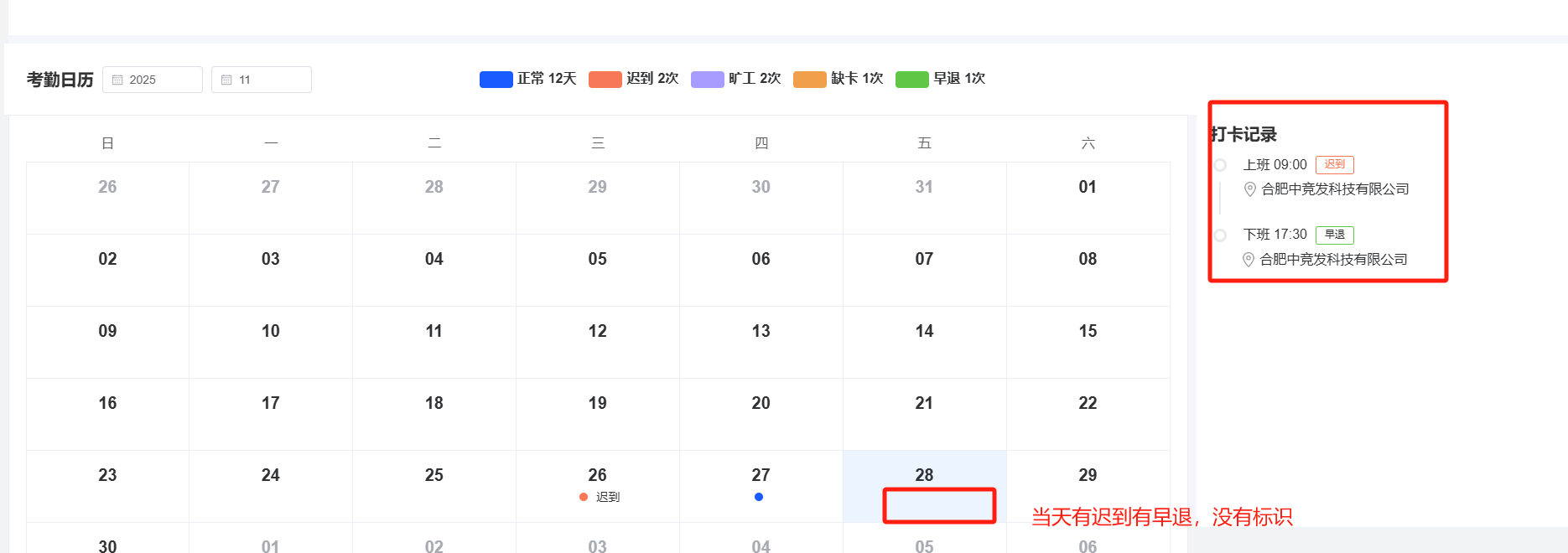 员工自助-我的假勤:当天有迟到有早退、缺卡等情况,日历中未显示标识 ;日历中正常和早退的颜色与原型不一致