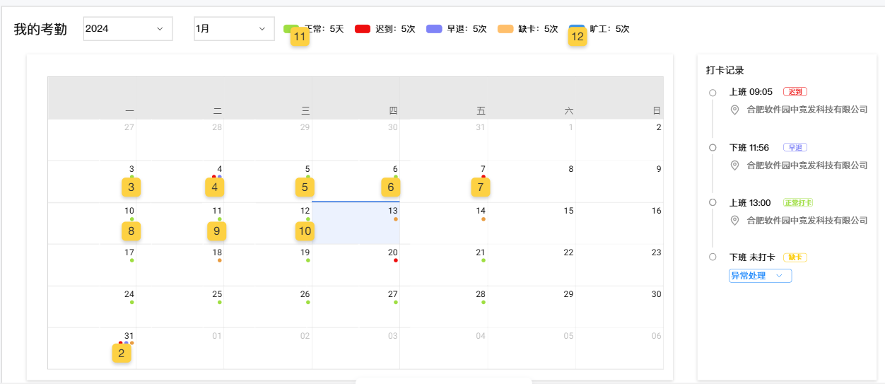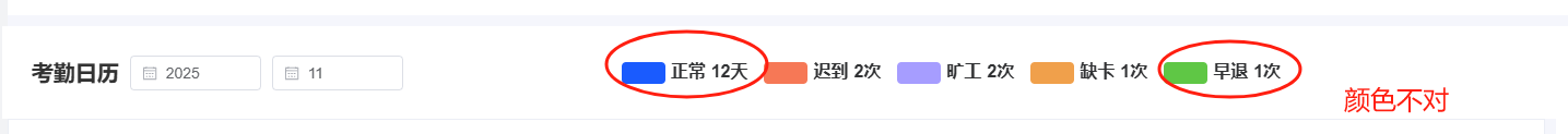 员工自助-我的假勤:当天有迟到有早退、缺卡等情况,日历中未限制标志 ;日历中正常和早退的颜色与原型不一致
