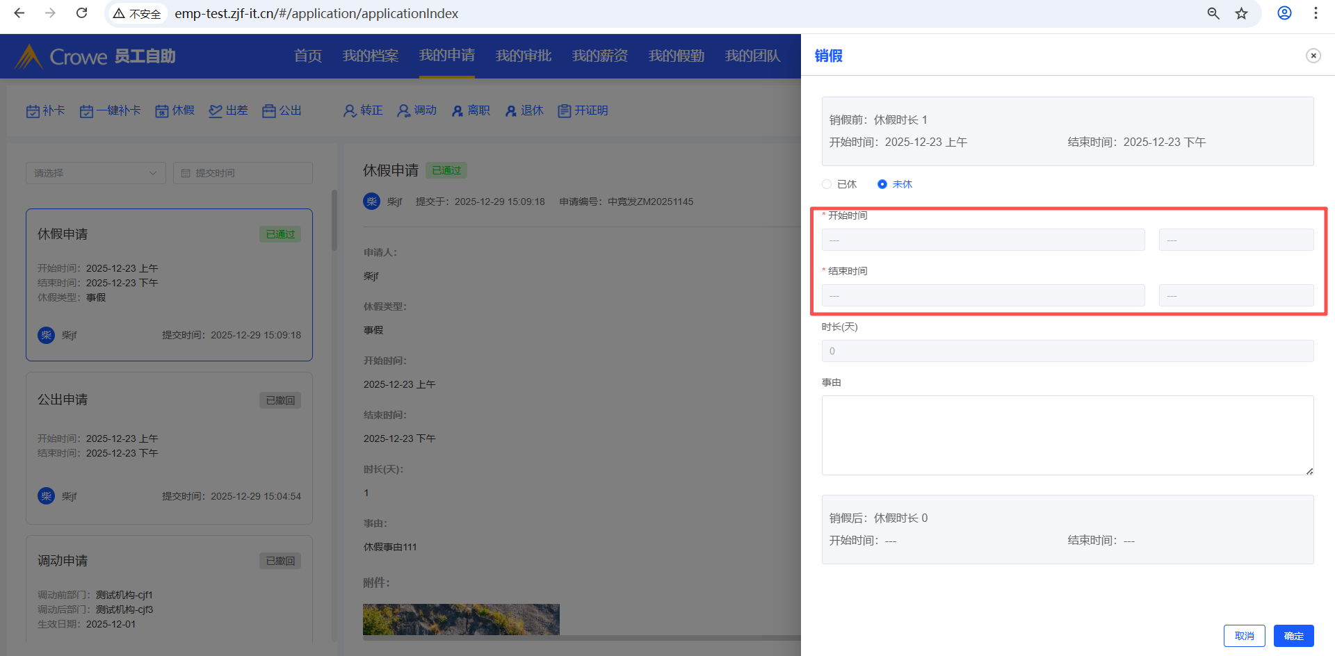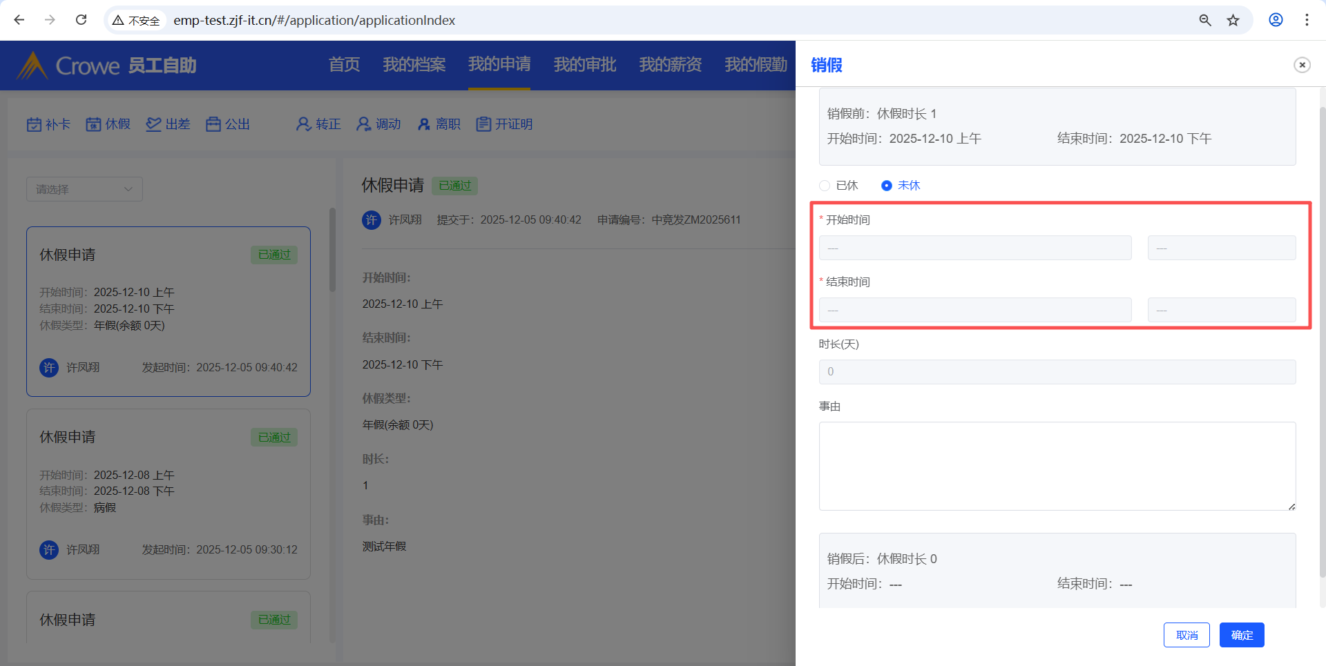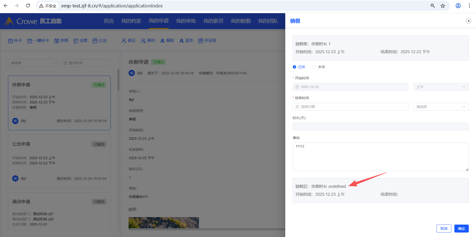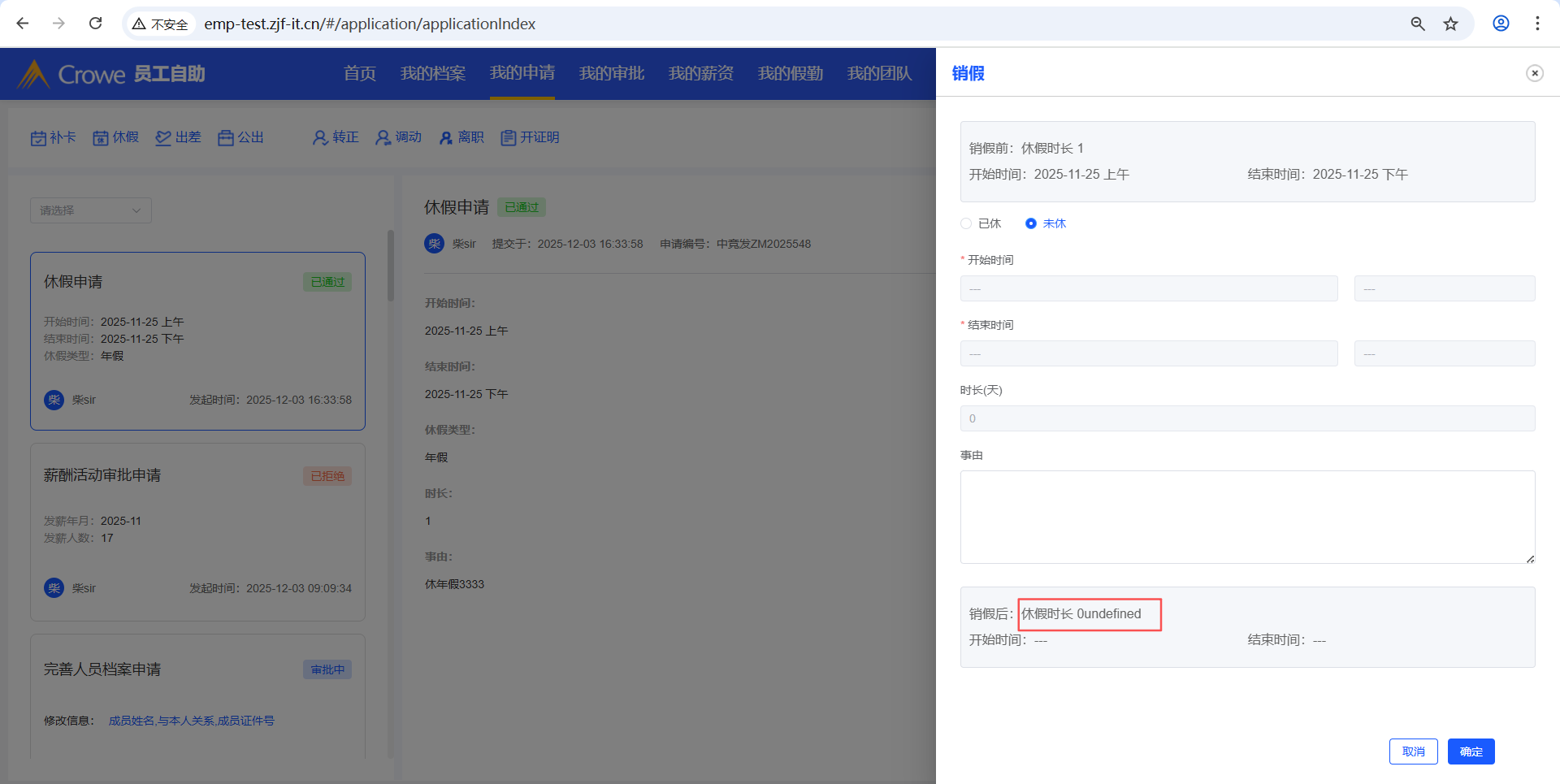 已关闭员工自助-我的申请,休假审批通过后,点击销假,点击未休,1、休假时长显示undefined,2、开始时间、结束时间无法选择,3、点击确定未调接口