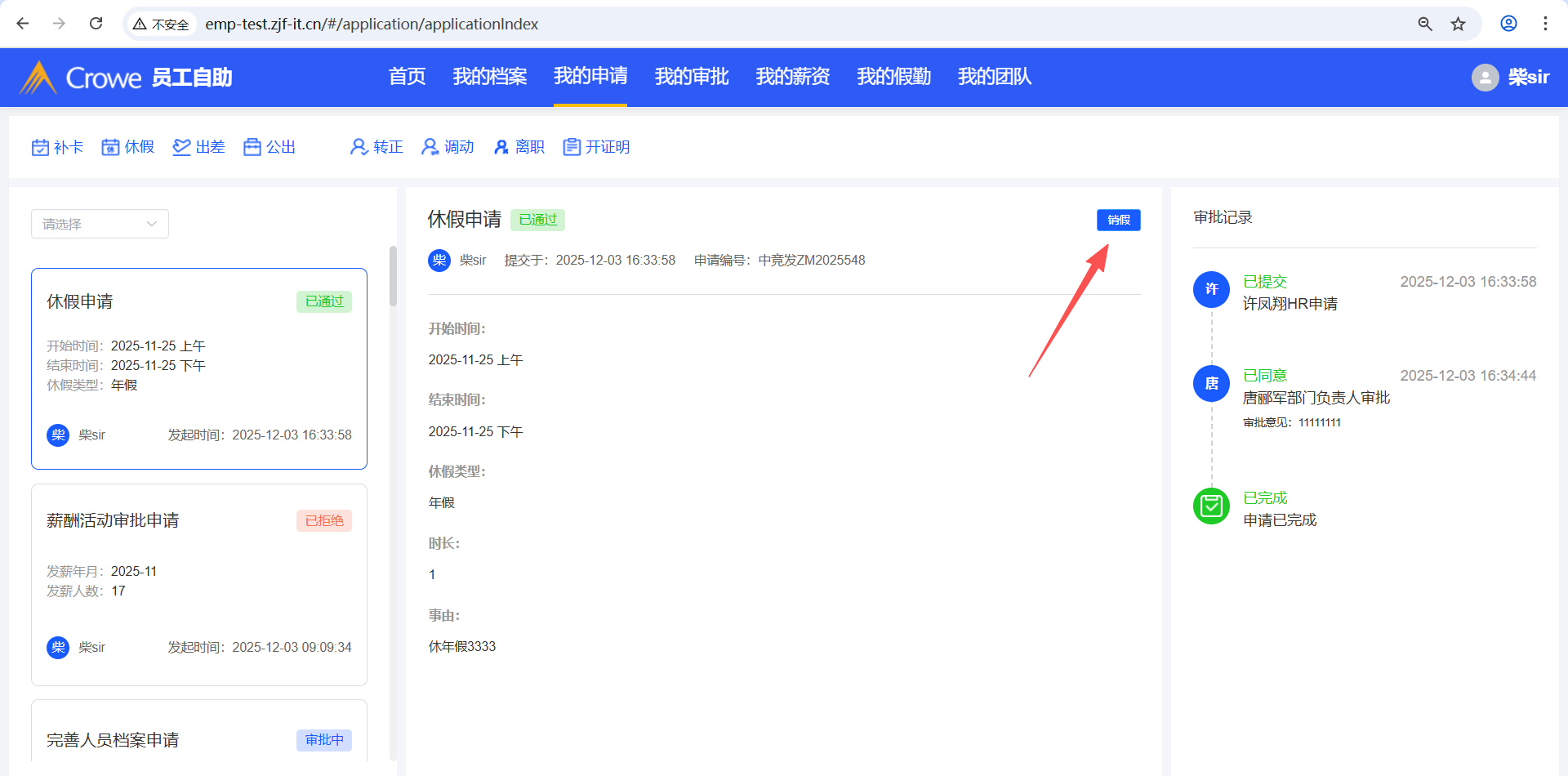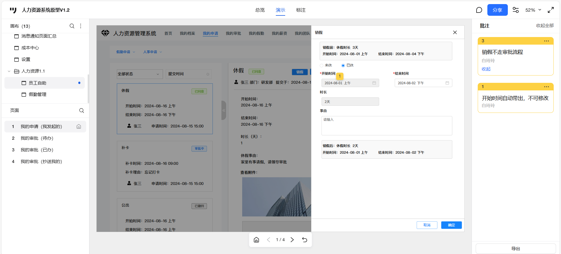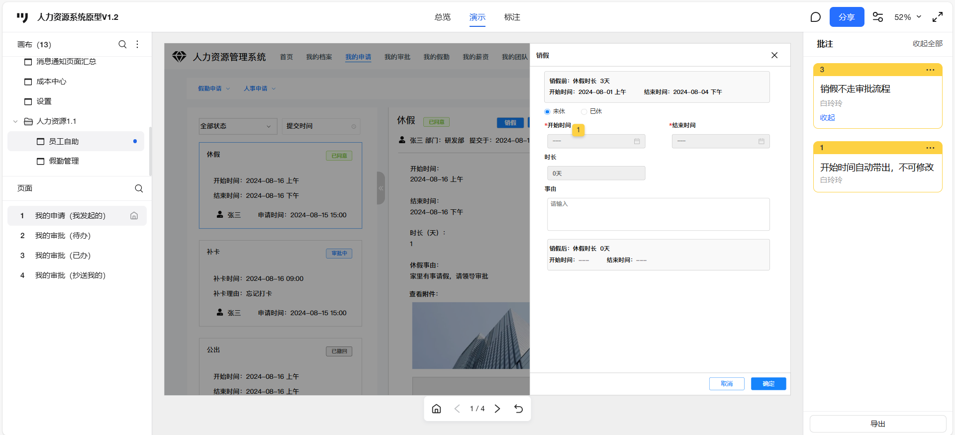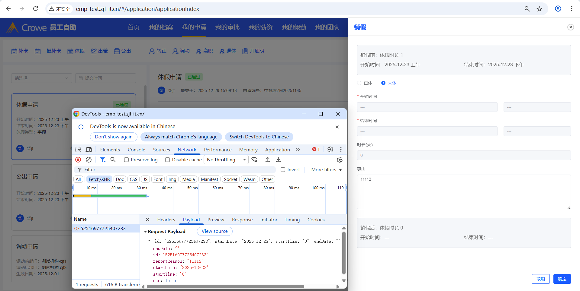 已关闭员工自助-我的申请,休假审批通过后,点击销假,点击未休,1、休假时长显示undefined,2、开始时间、结束时间无法选择,3、点击确定未调接口