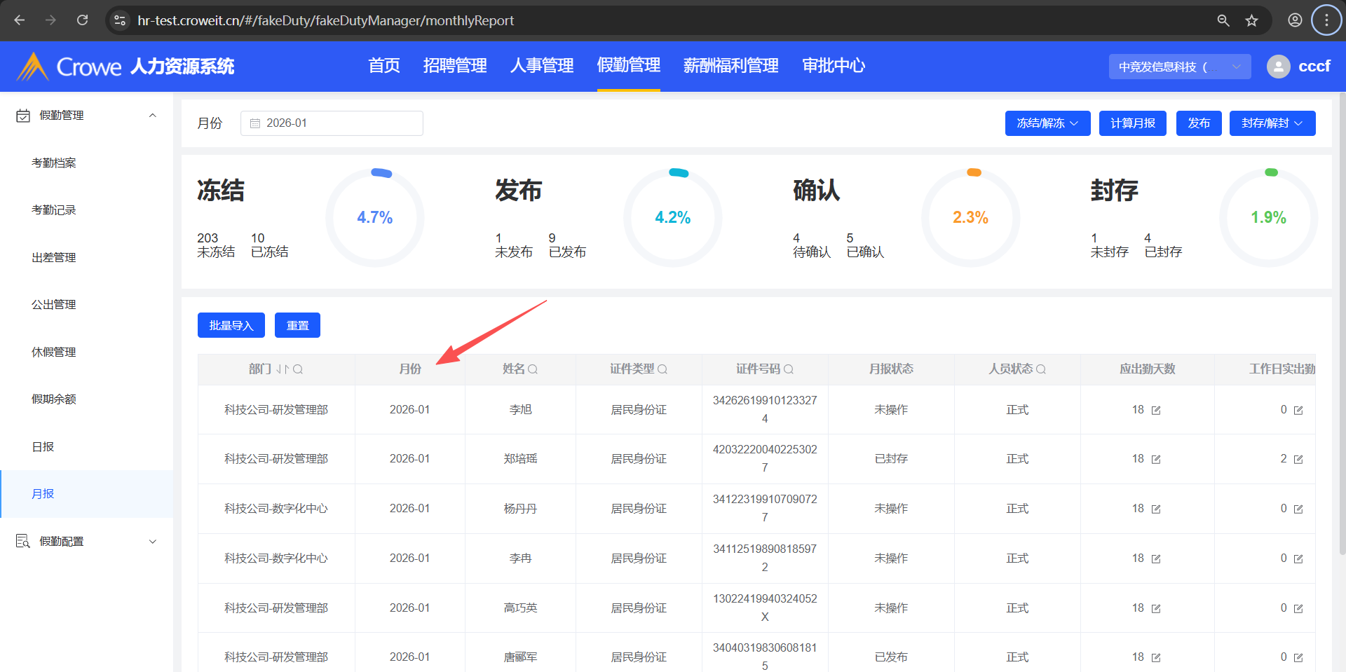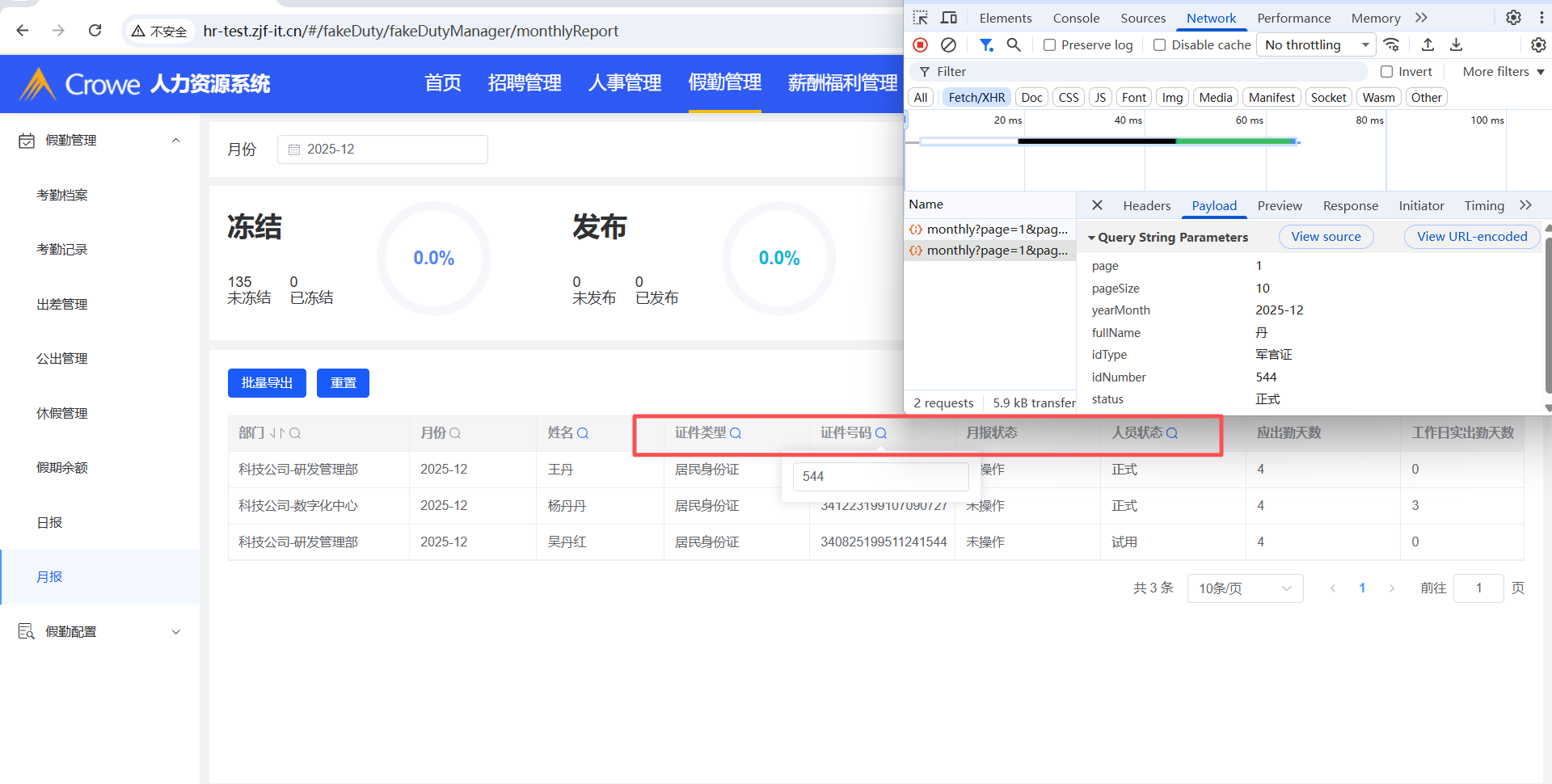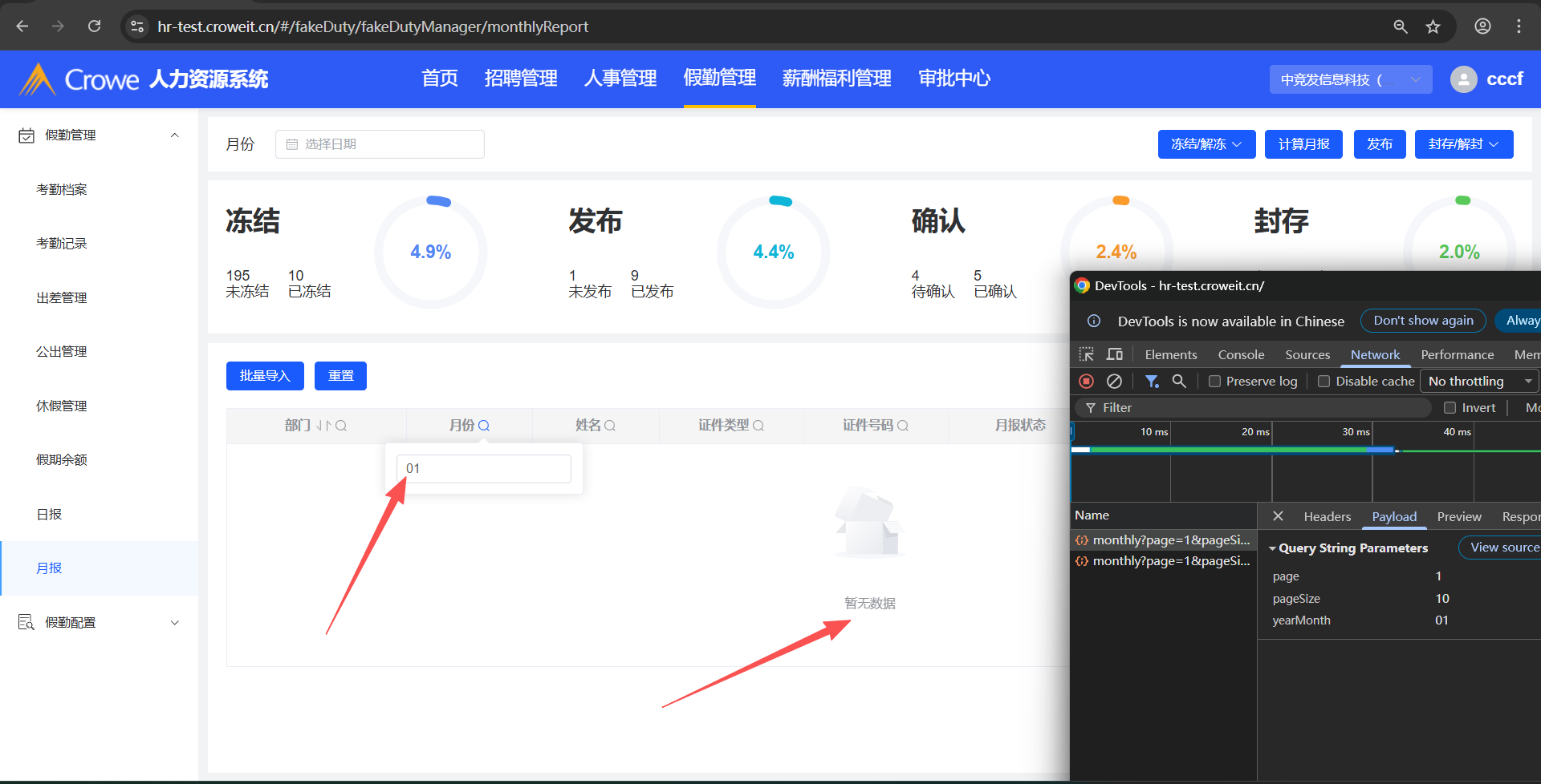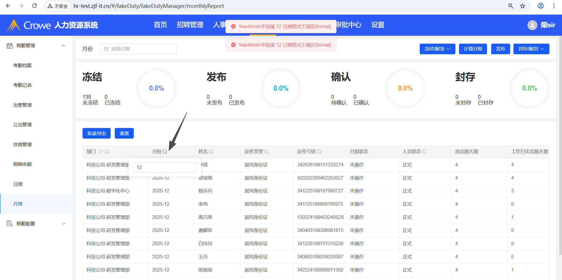 已关闭人力资源系统-假勤管理-月报,1、表头按照月份搜索,有报错,2、对所有表头的筛选,需排查修改