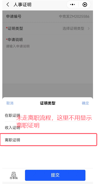 小程序-人事证明:没有走离职流程,正常员工不用显示离职证明选择(员工自助系统该员工也未显示)