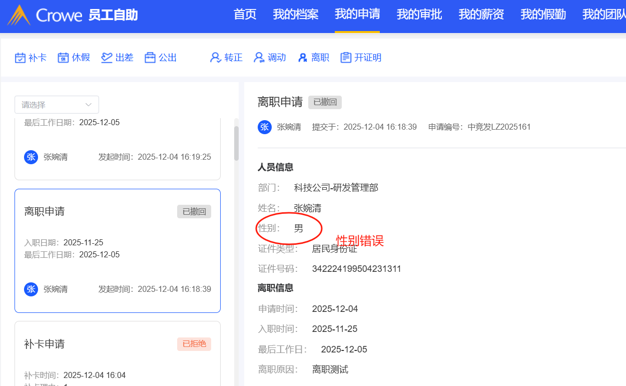 小程序发起的离职证明,在员工自助中查看,性别显示错误