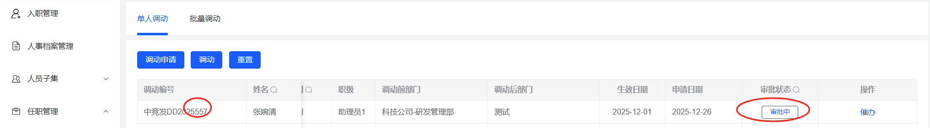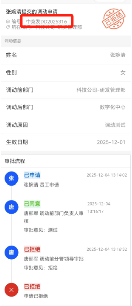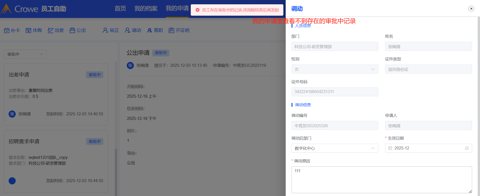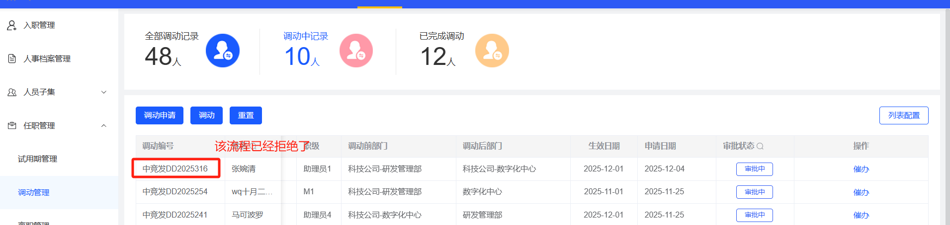 已关闭我的申请-调动申请:已经审批拒绝的流程,在调动管理中查看还在审批中