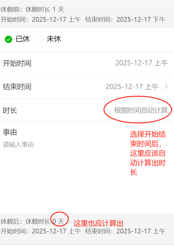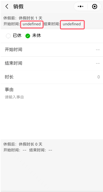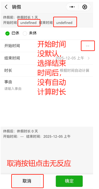 小程序-销假:开始时间结束时间显示异常,已休选择结束时间未自动计算时长,已休未休的取消按钮点击无反应