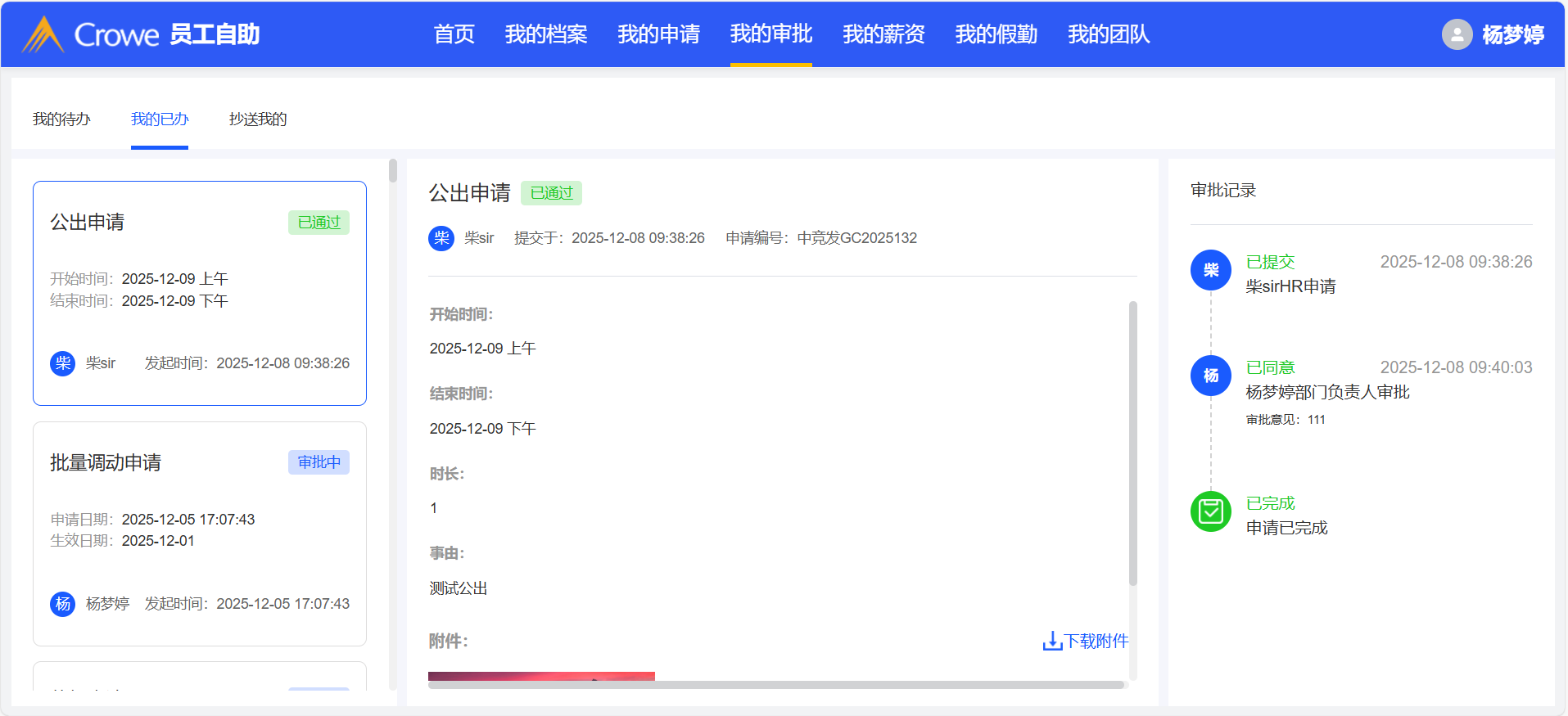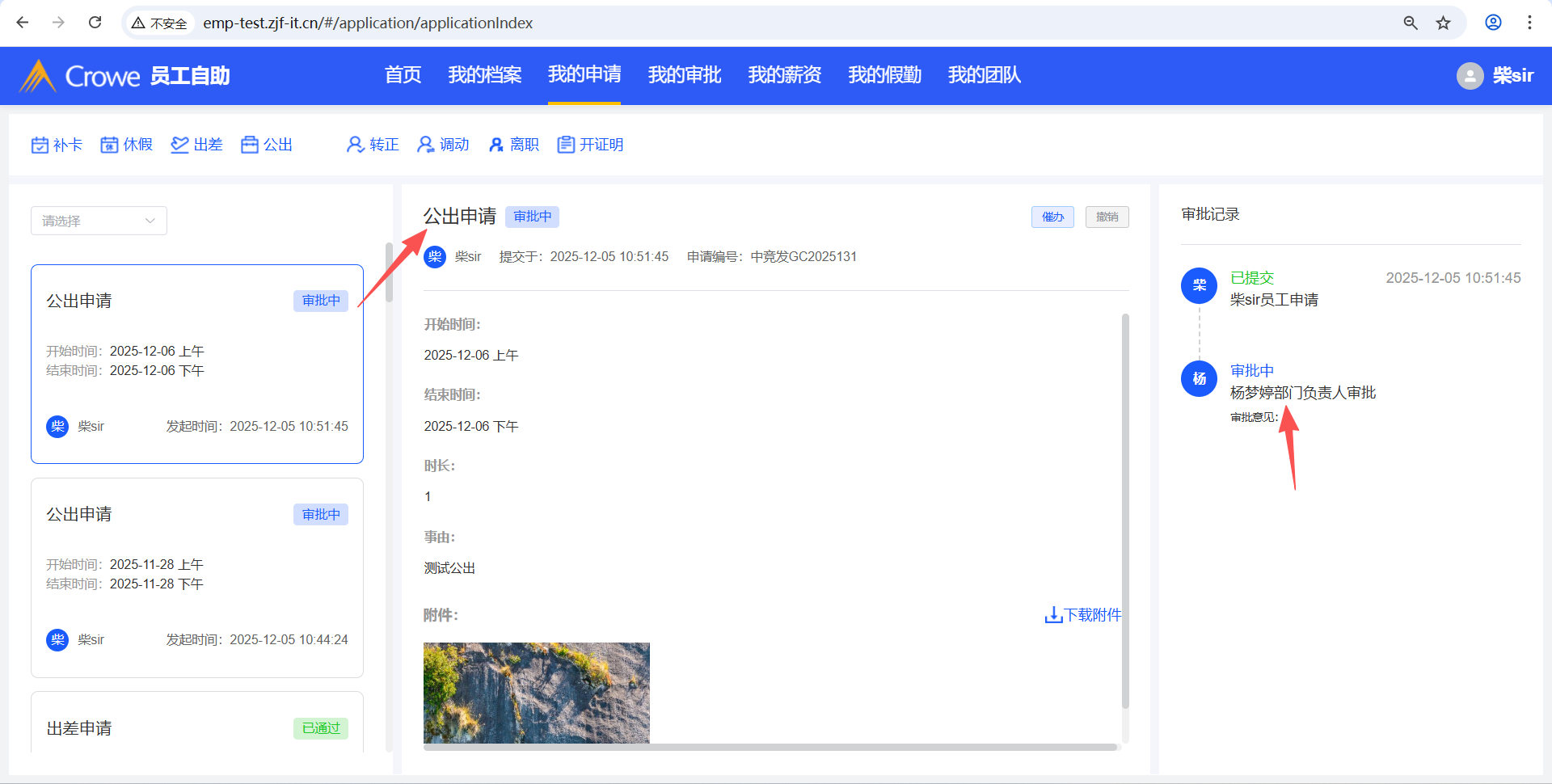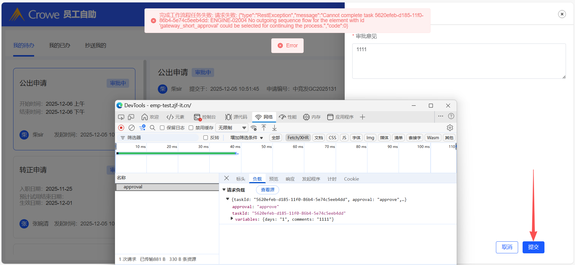 已关闭员工自助-我的审批-我的待办,对公出申请审核通过时,点击提交,有报错