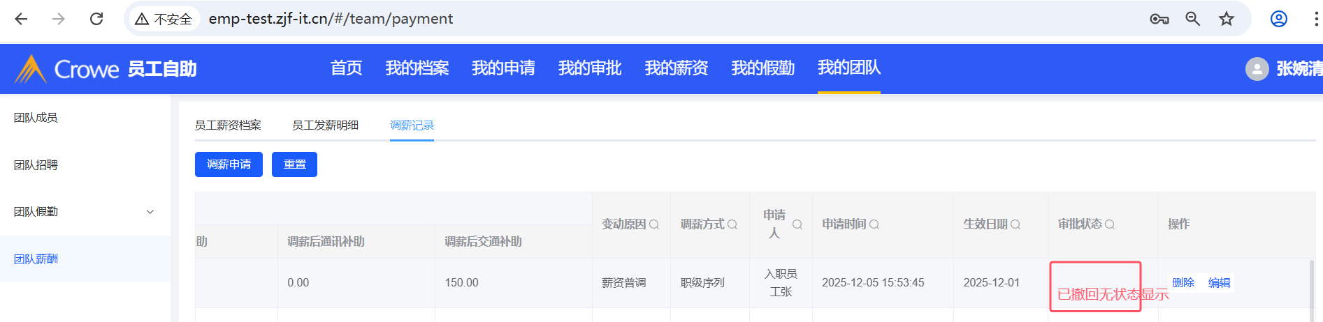 员工自助-我的团队-团队薪酬:调薪记录中,撤回后状态未显示