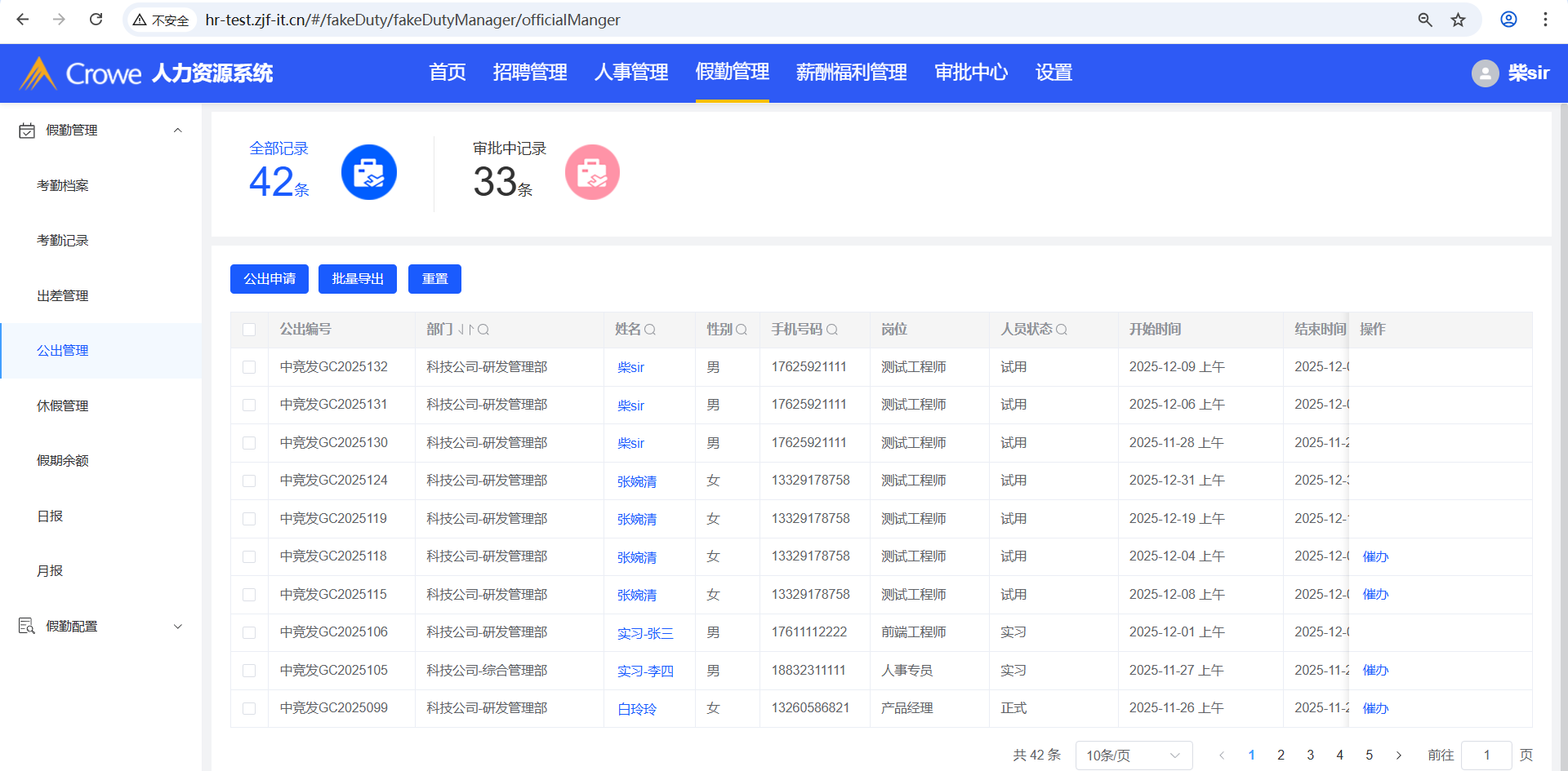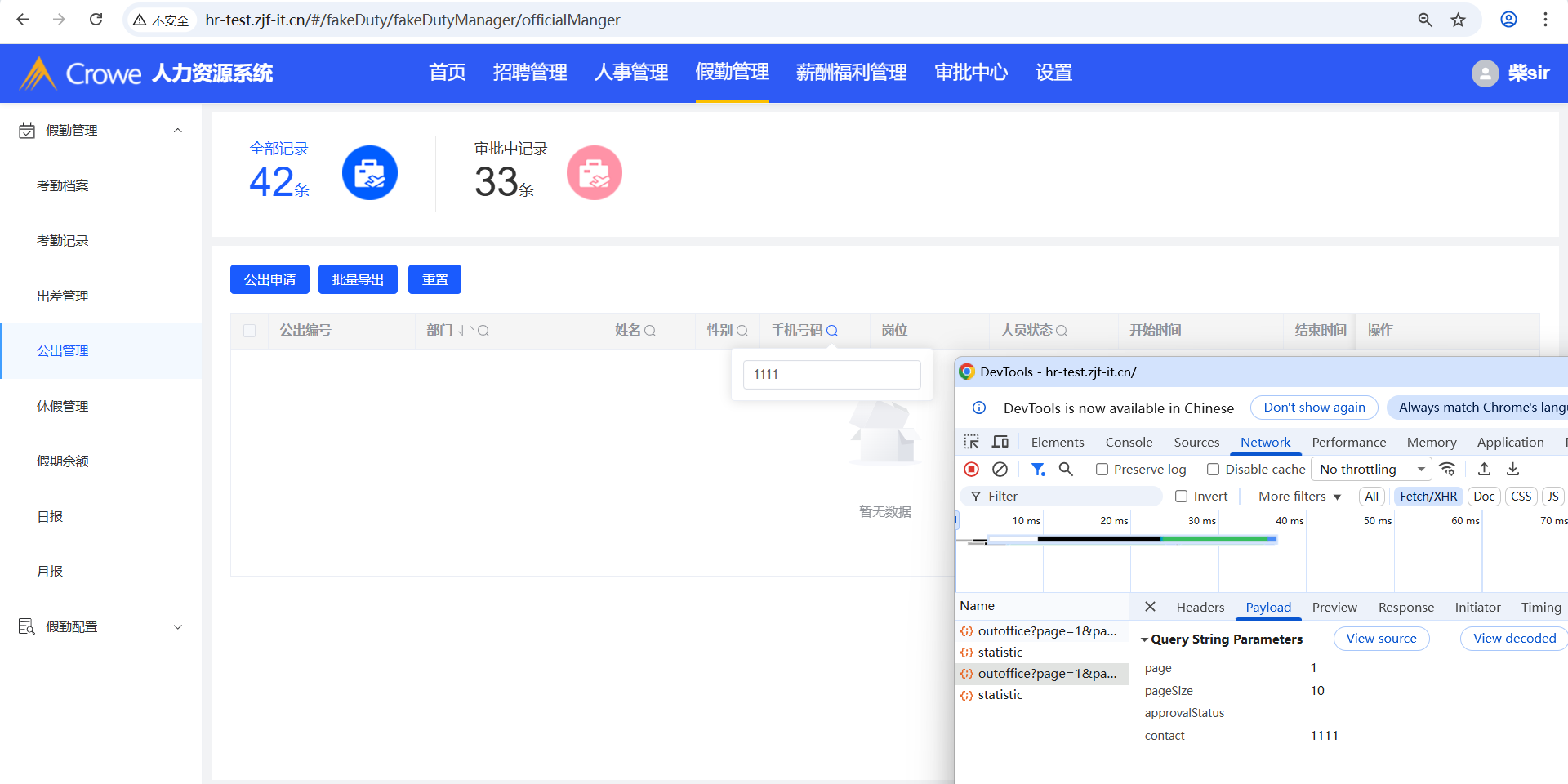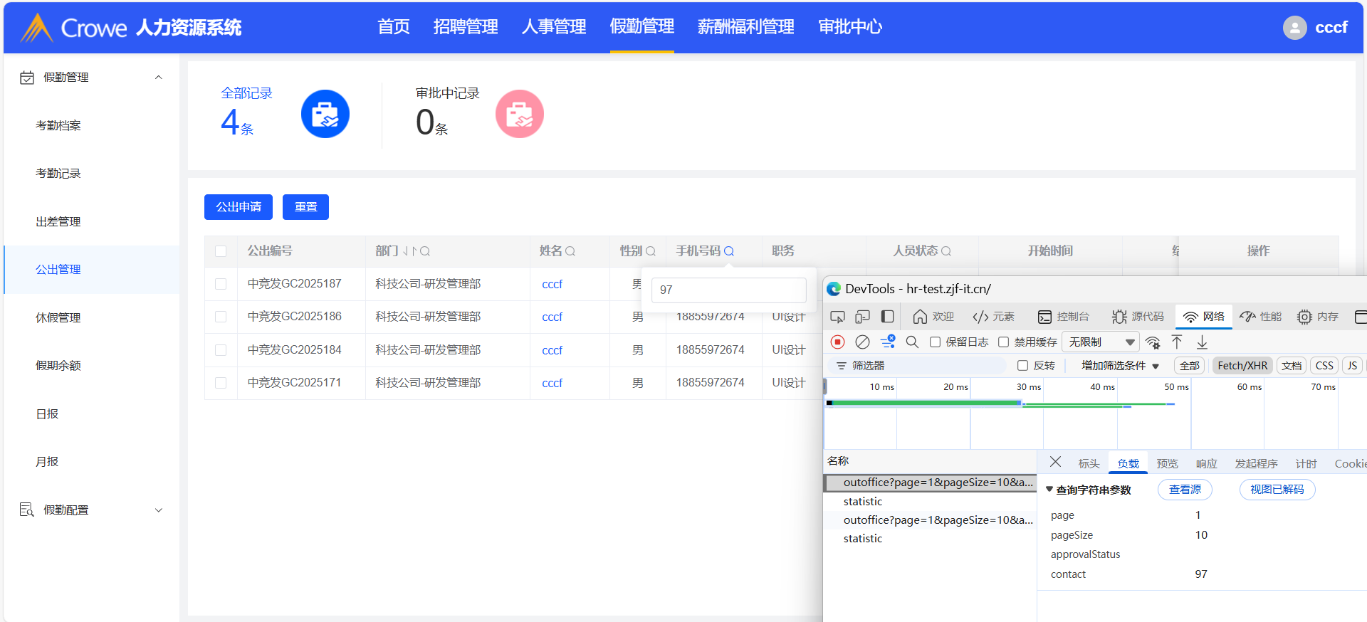 人力资源系统-假勤管理-公出管理,根据表头列:手机号码筛选,筛选出来的数据不对