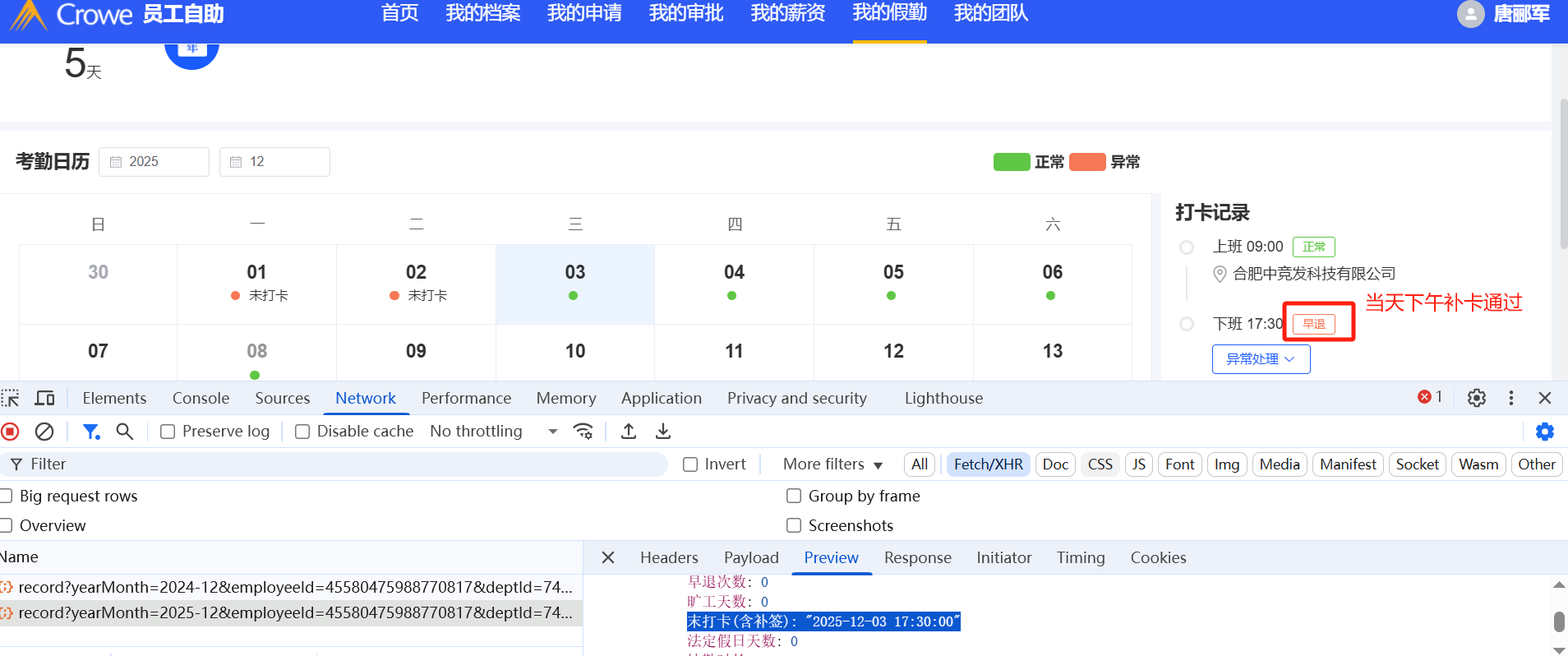 员工自助-我的假勤:补卡通过,打卡记录中仍显示早退